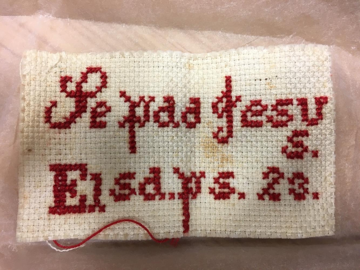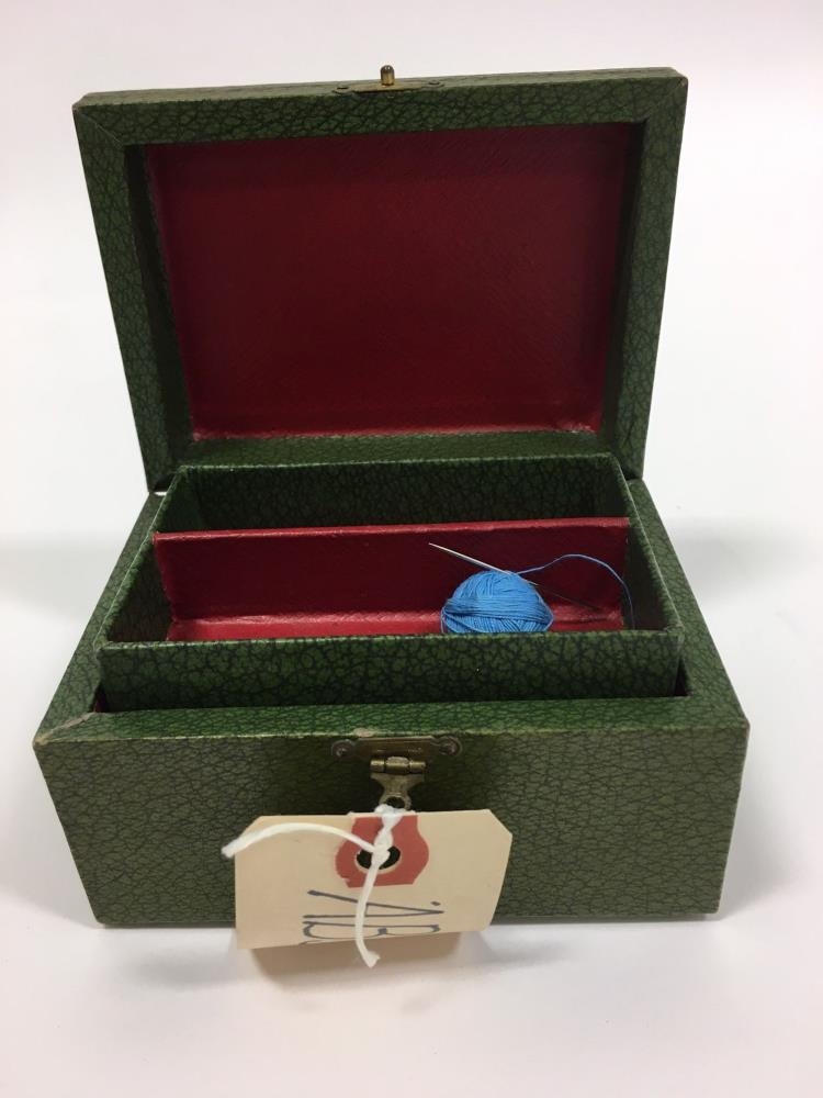 Lítill saumakassi, grænn að lit, klæddur að innan með rauðum pappír. laus skúffa í kassanum með tveimur hólfum. Áletrun á kassaloki: Work Box. Í saumakassanum er lítil útsaumsprufa, saumað með rauðu útsaumsgarni í ljósan jafa: Se paa Jesus. Elsd.ps. 23.