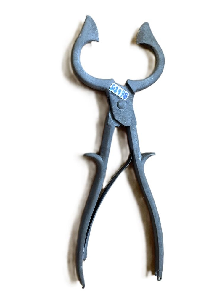 Sykurtangir úr járni smíðaðar af Friðriki Vigfússyni á Rauðhálsi, föður gefanda. Vanalegt lag. Friðrik dó 1916, f. 1871. Tangirnar eru nú um sinn varðveittar i dönskum súkkulaðikassa Tinu Jacobsen sem fylgdi töngunum frá Kristínu.