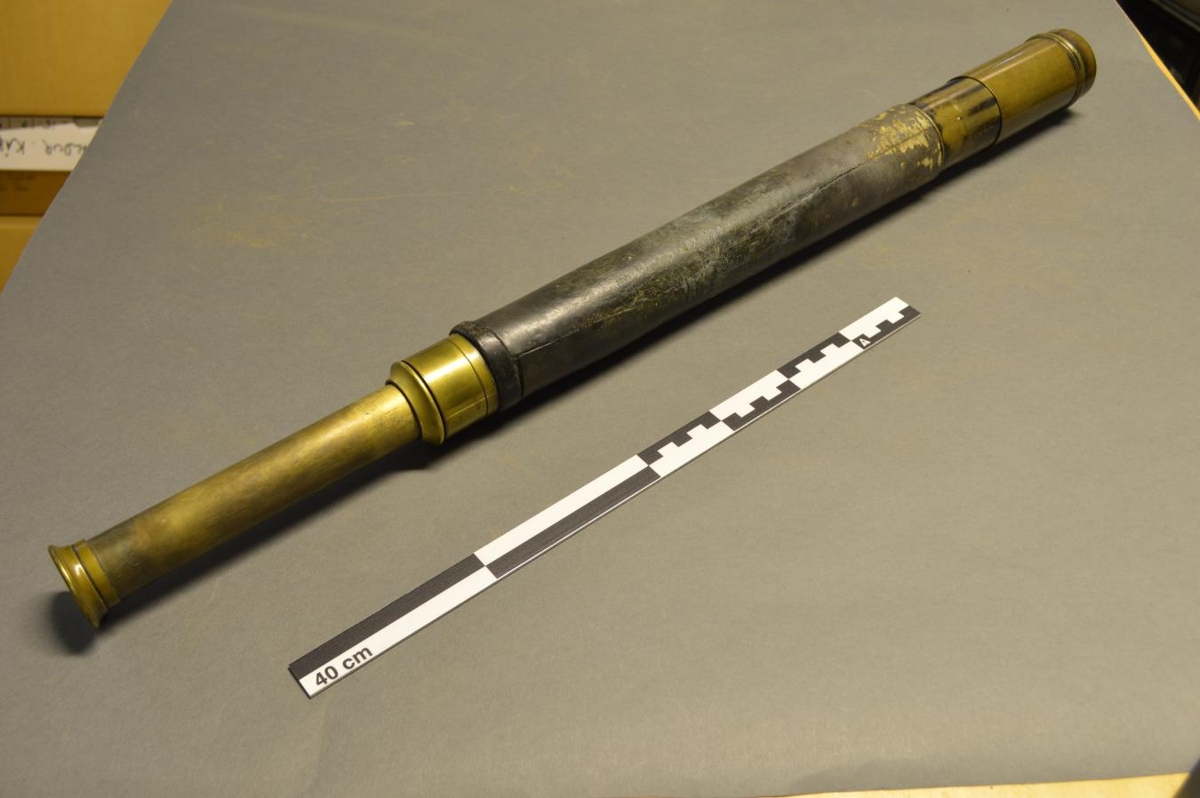 Sjónauki, sundurdreginn. Gerður fyrir eitt auga. Lengd 73 cm. Siggeir Lárusson faðir Kristins eignaðist hann frá strandi enska herskipsins Barrhead sem strandaði á Slýjafjöru í Meðallandi 29. des. 1940.