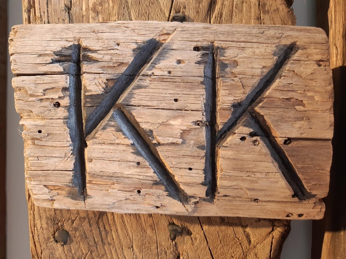 Rekamark á Kálfafellsfjöru, KK = Kálfafellskirkja. Lárus skar markið í gamlan trjábút af fjöru.
