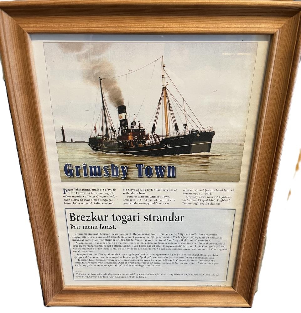 Stækkuð lituð ljósmynd, innrömmuð, af togaranum Grimsby Town sem strandaði á Mýrdalssandi 1946. Sbr. Sjómannatímaritið Víking.
