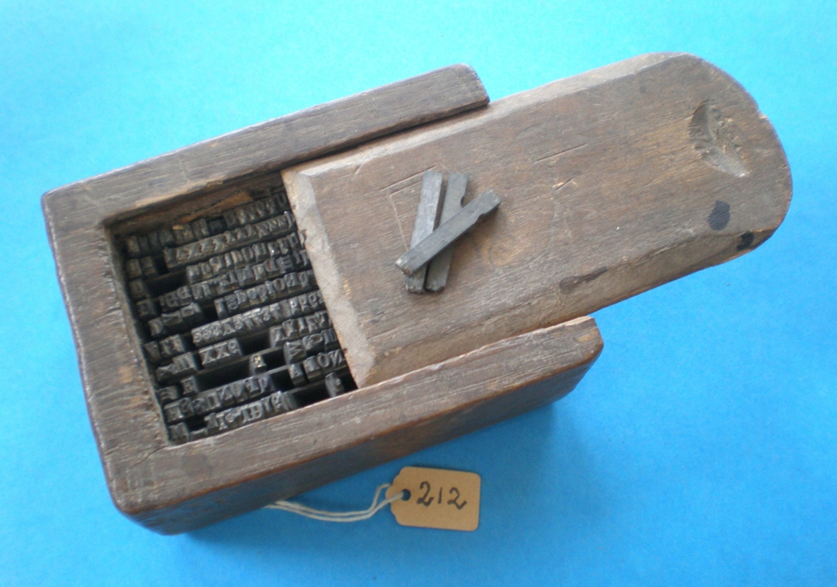 Eikarstokkur, 9 X 7 cm með renniloki og fullur af prentletri. Líklega var það notað til að gylla bækur.