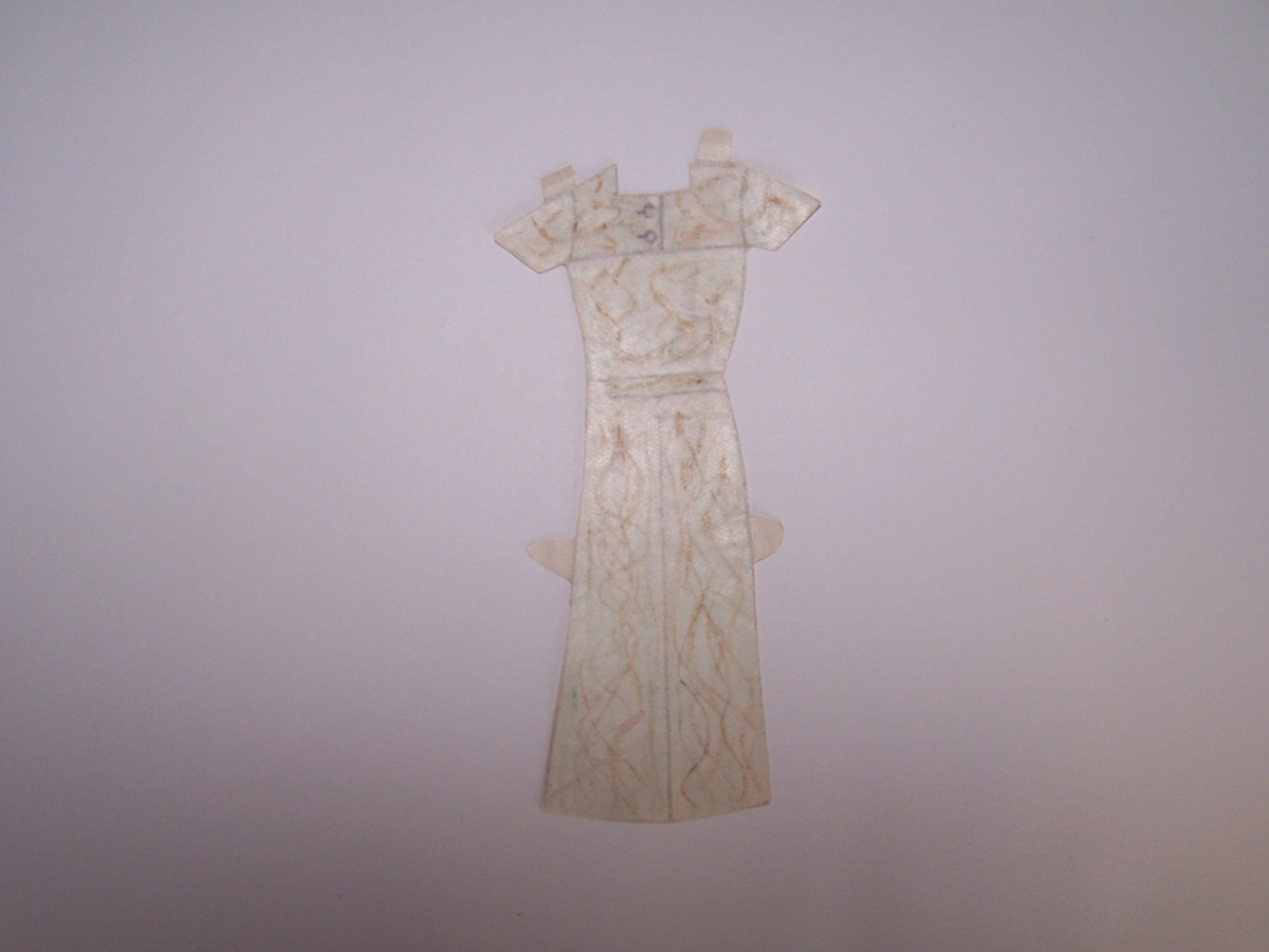 Heimagerður dúkkulísukjóll. Úr dúkkulísusafni Bryndísar Bjarnadóttur, sem ólst upp í Bjarnahúsi á Húsavík. Bryndís var ein af 15 systkinum (einnig átti hún eina fóstursystur) og var hún 5. í systraröðinni. Dúkkulísurnar gengu í arf á milli systra. Dúkkulísurnar voru klippar úr tískublöðum/Modeblöðum og príslistum/pöntunarlistum. Eldri systir Bryndísar, Ásta, reyndi oftast að ná öllu frá Bryndísi og þegar Bryndís fékk eina manninn í dúkkulísusafninu. Þá vildi Ásta fá hann og sagði systur sinni að hef hún ekki eignaðist manninn þá myndi hún deyja, „jæja Ásta mín þá verður þú bara að deyja“ svaraði Bryndísþ. Bryndís gaf yngri systur sinni dúkkulísurnar, Hansínu Margréti Bjarnadóttir, sem passaði mjög vel upp á alla hluti og hún geymdi þær upp á háalofti, á Reykjum í Mosfellssveit. Dúkkulísurnar komust svo aftur í eigu Bryndísar eftir að Margrét Hansína dó. Dúkkulísurnar voru otaðar að vetrarlagi, þegar ekki var útiveður. Tvær til þrjár systur léku sér þá með dúkkulísurnar á rúmum í svefnherbergjum á loftinu, Helga Sigurjóns og Solla Jónasar vinkonur þeirra komu úr næstu húsum til að taka þátt í leiknum. .