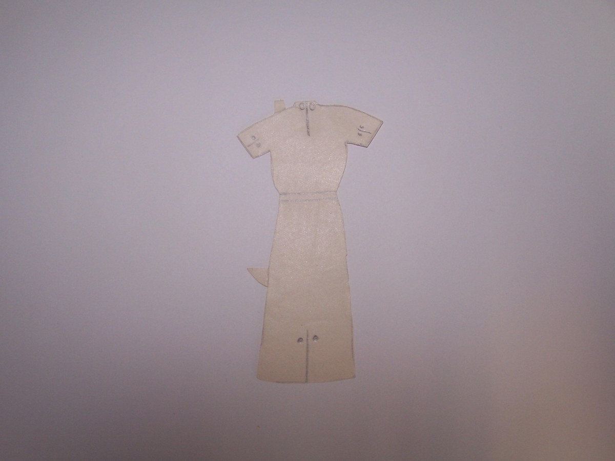 Heimagerður dúkkulísukjóll. Úr dúkkulísusafni Bryndísar Bjarnadóttur, sem ólst upp í Bjarnahúsi á Húsavík. Bryndís var ein af 15 systkinum (einnig átti hún eina fóstursystur) og var hún 5. í systraröðinni. Dúkkulísurnar gengu í arf á milli systra. Dúkkulísurnar voru klippar úr tískublöðum/Modeblöðum og príslistum/pöntunarlistum. Eldri systir Bryndísar, Ásta, reyndi oftast að ná öllu frá Bryndísi og þegar Bryndís fékk eina manninn í dúkkulísusafninu. Þá vildi Ásta fá hann og sagði systur sinni að hef hún ekki eignaðist manninn þá myndi hún deyja, „jæja Ásta mín þá verður þú bara að deyja“ svaraði Bryndísþ. Bryndís gaf yngri systur sinni dúkkulísurnar, Hansínu Margréti Bjarnadóttir, sem passaði mjög vel upp á alla hluti og hún geymdi þær upp á háalofti, á Reykjum í Mosfellssveit. Dúkkulísurnar komust svo aftur í eigu Bryndísar eftir að Margrét Hansína dó. Dúkkulísurnar voru otaðar að vetrarlagi, þegar ekki var útiveður. Tvær til þrjár systur léku sér þá með dúkkulísurnar á rúmum í svefnherbergjum á loftinu, Helga Sigurjóns og Solla Jónasar vinkonur þeirra komu úr næstu húsum til að taka þátt í leiknum. .