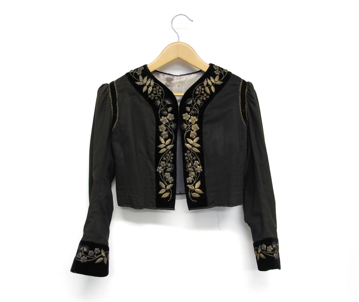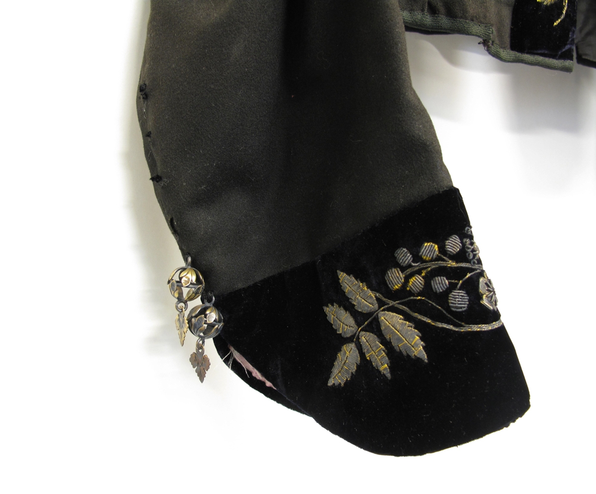 Skauttreyja úr svörtu klæði, með svarbláum treyjuborðum, leggingum í handveg og bak og fremst á ermum. Treyjuborðarnir og borðarnir fremst á ermum eru baldýraðir með gylltum vírþræði. Mynstrið er holtasóley. Treyjubolurinn er fóðraður með gráu silki, ermarnar með ljósu lérefti en borðarnir fremst á ermum með bleiku satínefni. Á hvorri ermi hafa verið sex ermahnappar úr koparblöndu, gagnskornir, með laufamynstri og niður úr hverjum eitt lauf. Nú eru einungis tveir þeirra fastir við treyjuna, báðir á hægri ermi, en fjórir hnappar fylgja lausir með. Aðrir hafa glatast. Mikið hefur fallið á málminn. Á ermunum eru göt og rifur þar sem hnapparnir hafa verið festir. Treyjunni er krækt að framan með sjö krókapörum að neðan og einu að ofan. Hún er orðin eilítið slitin.