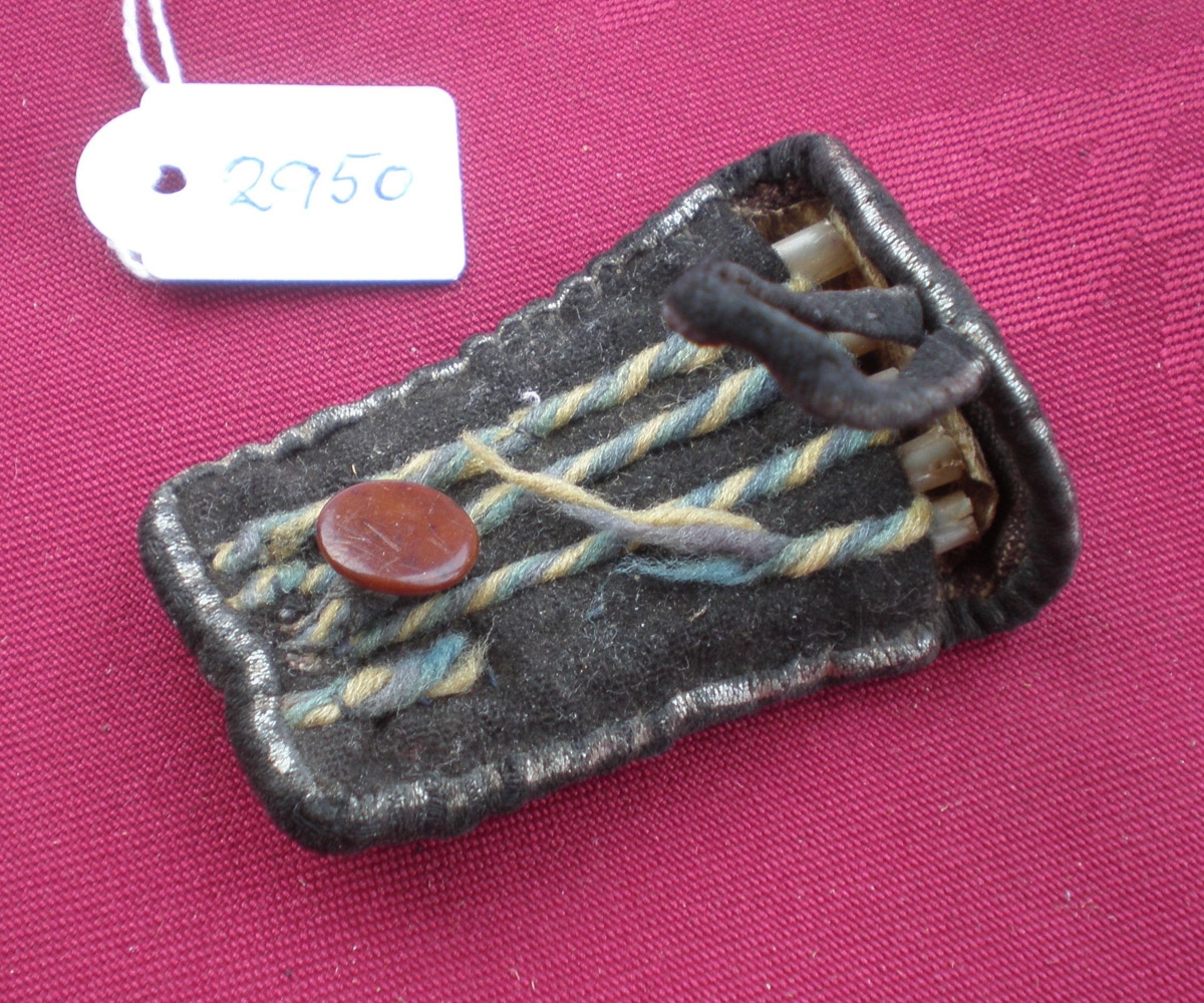 Nálaprilla úr voð og fjaðurstöfum, með skrautböndum og silfurísaumi.