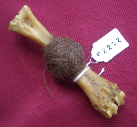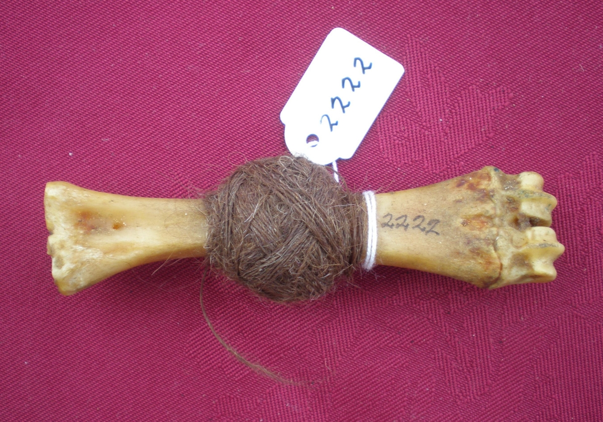Þráðarleggur með mórauðu garni, lengd 10.5 cm.