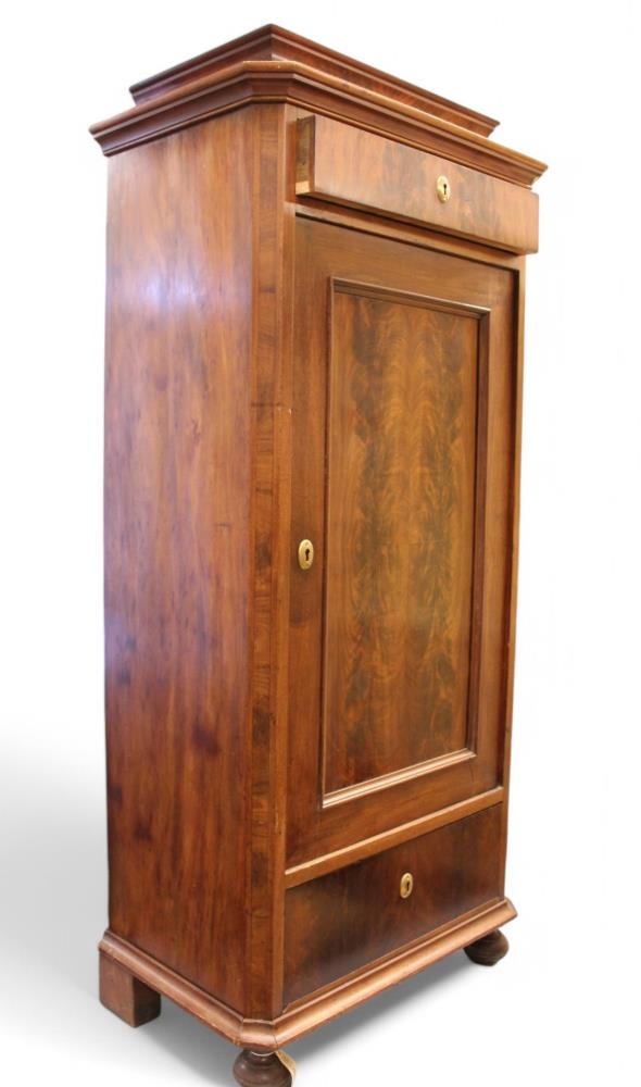 Skápur úr hnotu, póleraður, vandaður, á fjórum litlum fótum. Efst og neðst eru skúffur en skáphurð á milli. Neðri skúffan breiðari en sú efri.