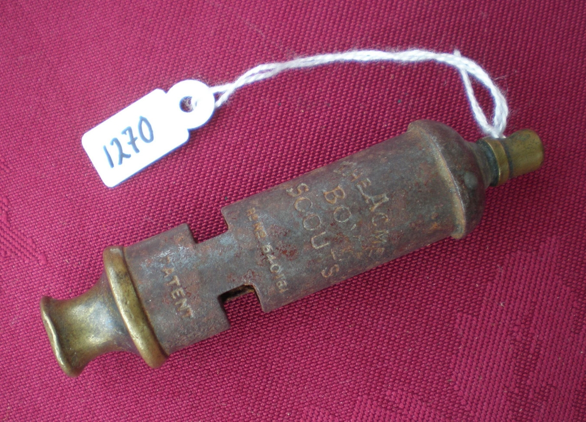 Flauta úr látúni, 7.5 x 1.5 cm. Á flautunni stendur, The ACME Boy scouts, Re. no. 640164.