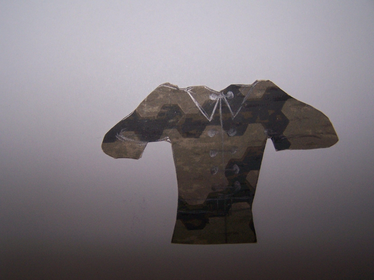 Döö- og ljósgrár mynstraður dúkkulísujakki, stutterma, handteiknaður. Úr dúkkulísusafni Bryndísar Bjarnadóttur, sem ólst upp í Bjarnahúsi á Húsavík. Bryndís var ein af 15 systkinum (einnig átti hún eina fóstursystur) og var hún 5. í systraröðinni. Dúkkulísurnar gengu í arf á milli systra. Dúkkulísurnar voru klippar úr tískublöðum/Modeblöðum og príslistum/pöntunarlistum. Eldri systir Bryndísar, Ásta, reyndi oftast að ná öllu frá Bryndísi og þegar Bryndís fékk eina manninn í dúkkulísusafninu. Þá vildi Ásta fá hann og sagði systur sinni að hef hún ekki eignaðist manninn þá myndi hún deyja, „jæja Ásta mín þá verður þú bara að deyja“ svaraði Bryndís þá. Bryndís gaf yngri systur sinni dúkkulísurnar, Hansínu Margréti Bjarnadóttir, sem passaði mjög vel upp á alla hluti og hún geymdi þær upp á háalofti, á Reykjum í Mosfellssveit. Dúkkulísurnar komust svo aftur í eigu Bryndísar eftir að Margrét Hansína dó. Dúkkulísurnar voru otaðar að vetrarlagi, þegar ekki var útiveður. Tvær til þrjár systur léku sér þá með dúkkulísurnar á rúmum í svefnherbergjum á loftinu, Helga Sigurjóns og Solla Jónasar vinkonur þeirra komu úr næstu húsum til að taka þátt í leiknum. .