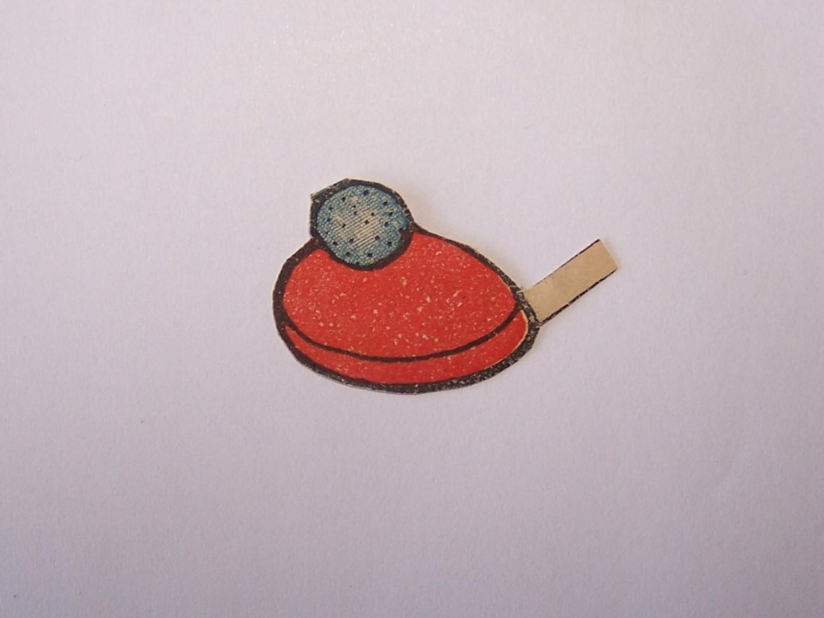 Dúkkulísuhúfa, rauð með bláum dúsk. Úr dúkkulísusafni Bryndísar Bjarnadóttur, sem ólst upp í Bjarnahúsi á Húsavík. Bryndís var ein af 15 systkinum (einnig átti hún eina fóstursystur) og var hún 5. í systraröðinni. Dúkkulísurnar gengu í arf á milli systra. Dúkkulísurnar voru klippar úr tískublöðum/Modeblöðum og príslistum/pöntunarlistum. Eldri systir Bryndísar, Ásta, reyndi oftast að ná öllu frá Bryndísi og þegar Bryndís fékk eina manninn í dúkkulísusafninu. Þá vildi Ásta fá hann og sagði systur sinni að hef hún ekki eignaðist manninn þá myndi hún deyja, „jæja Ásta mín þá verður þú bara að deyja“ svaraði Bryndís þá. Bryndís gaf yngri systur sinni dúkkulísurnar, Hansínu Margréti Bjarnadóttir, sem passaði mjög vel upp á alla hluti og hún geymdi þær upp á háalofti, á Reykjum í Mosfellssveit. Dúkkulísurnar komust svo aftur í eigu Bryndísar eftir að Margrét Hansína dó. Dúkkulísurnar voru otaðar að vetrarlagi, þegar ekki var útiveður. Tvær til þrjár systur léku sér þá með dúkkulísurnar á rúmum í svefnherbergjum á loftinu, Helga Sigurjóns og Solla Jónasar vinkonur þeirra komu úr næstu húsum til að taka þátt í leiknum. .