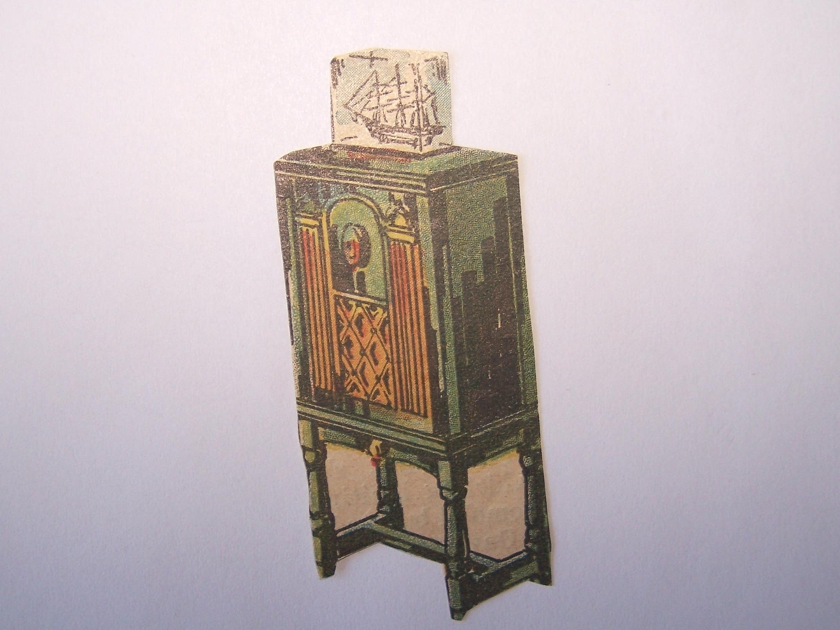Grænn skápur úr pappír, úr pappír, klipptur út úr blaði. Úr dúkkulísusafni Bryndísar Bjarnadóttur, sem ólst upp í Bjarnahúsi á Húsavík. Bryndís var ein af 15 systkinum (einnig átti hún eina fóstursystur) og var hún 5. í systraröðinni. Dúkkulísurnar gengu í arf á milli systra. Dúkkulísurnar voru klippar úr tískublöðum/Modeblöðum og príslistum/pöntunarlistum. Eldri systir Bryndísar, Ásta, reyndi oftast að ná öllu frá Bryndísi og þegar Bryndís fékk eina manninn í dúkkulísusafninu. Þá vildi Ásta fá hann og sagði systur sinni að hef hún ekki eignaðist manninn þá myndi hún deyja, „jæja Ásta mín þá verður þú bara að deyja“ svaraði Bryndís þá. Bryndís gaf yngri systur sinni dúkkulísurnar, Hansínu Margréti Bjarnadóttir, sem passaði mjög vel upp á alla hluti og hún geymdi þær upp á háalofti, á Reykjum í Mosfellssveit. Dúkkulísurnar komust svo aftur í eigu Bryndísar eftir að Margrét Hansína dó. Dúkkulísurnar voru otaðar að vetrarlagi, þegar ekki var útiveður. Tvær til þrjár systur léku sér þá með dúkkulísurnar á rúmum í svefnherbergjum á loftinu, Helga Sigurjóns og Solla Jónasar vinkonur þeirra komu úr næstu húsum til að taka þátt í leiknum. .