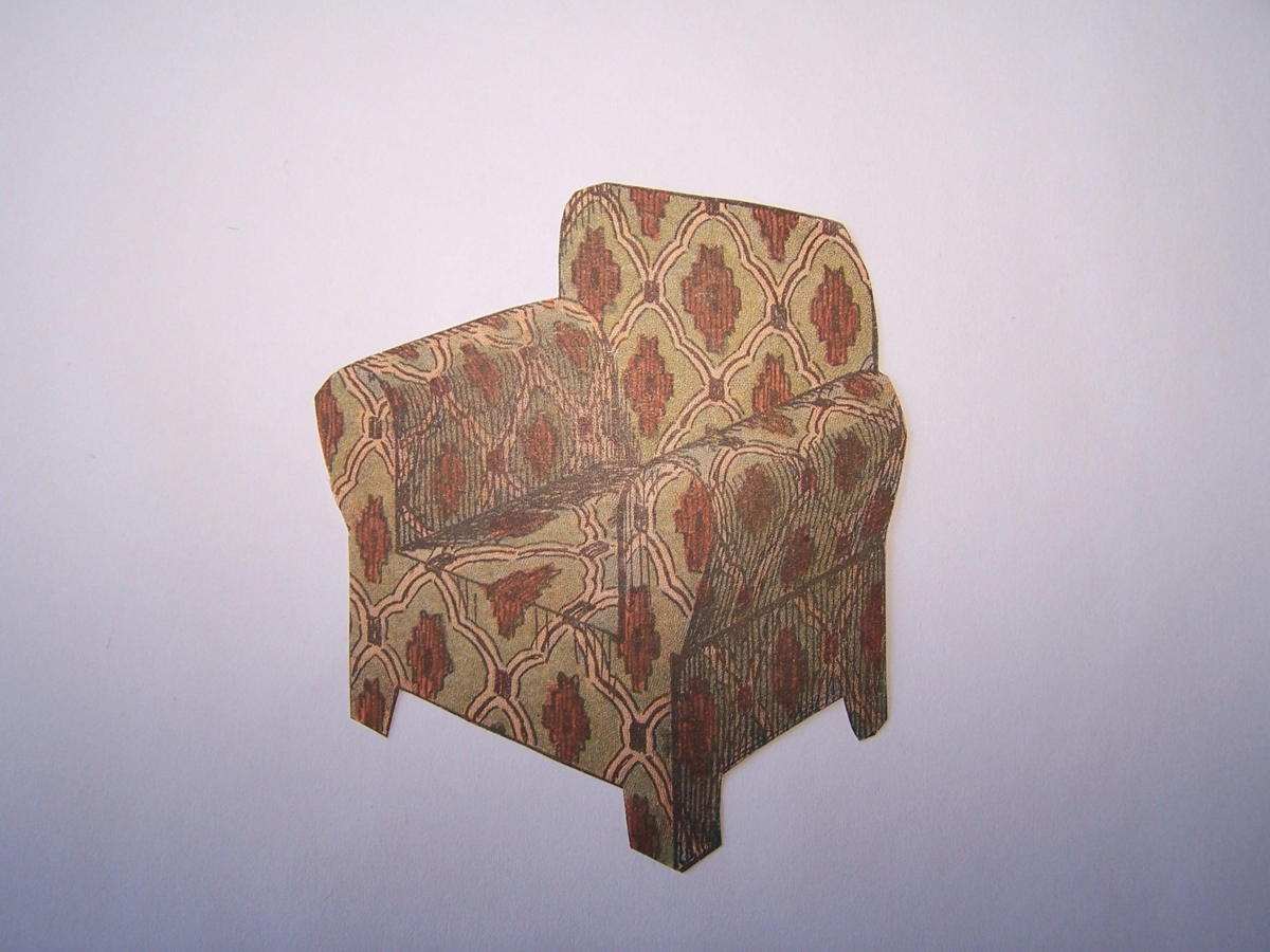 Mynstraður hægindastóll, klipptur út úr dagblaði. Úr dúkkulísusafni Bryndísar Bjarnadóttur, sem ólst upp í Bjarnahúsi á Húsavík. Bryndís var ein af 15 systkinum (einnig átti hún eina fóstursystur) og var hún 5. í systraröðinni. Dúkkulísurnar gengu í arf á milli systra. Dúkkulísurnar voru klippar úr tískublöðum/Modeblöðum og príslistum/pöntunarlistum. Eldri systir Bryndísar, Ásta, reyndi oftast að ná öllu frá Bryndísi og þegar Bryndís fékk eina manninn í dúkkulísusafninu. Þá vildi Ásta fá hann og sagði systur sinni að hef hún ekki eignaðist manninn þá myndi hún deyja, „jæja Ásta mín þá verður þú bara að deyja“ svaraði Bryndís þá. Bryndís gaf yngri systur sinni dúkkulísurnar, Hansínu Margréti Bjarnadóttir, sem passaði mjög vel upp á alla hluti og hún geymdi þær upp á háalofti, á Reykjum í Mosfellssveit. Dúkkulísurnar komust svo aftur í eigu Bryndísar eftir að Margrét Hansína dó. Dúkkulísurnar voru otaðar að vetrarlagi, þegar ekki var útiveður. Tvær til þrjár systur léku sér þá með dúkkulísurnar á rúmum í svefnherbergjum á loftinu, Helga Sigurjóns og Solla Jónasar vinkonur þeirra komu úr næstu húsum til að taka þátt í leiknum. .