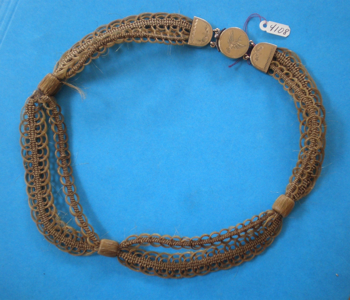 Lýsing: Á lásnum, sem er gylltur, er bréfdúfa, en aftan á honum eru mjög smáir stafir, líklega fangamark þess, sem gerði festina. Festin er mjög vel gerð og festingarnar í samræmi. Gefandi árið1998: Ragnheiður Bjarnadóttir (1912-2012) (áður ranglega skráð frá Nesi í Reykholtsdal). Ragnheiður var alin upp á Húsavík en bjó lengst af á Akureyri (í Austubyggð 10). Hún fluttist til Reykjavíkur rúmlega 80 ára og lést á Dvalar- og hjúkrunarheimilinu Grund á aðfangadag 2012. Festin var í eigu ömmu hennar, Ragnheiðar Helgadóttur frá Knarrarnesi á Mýrum (1855-1946). Festin er gerð úr hári Steinunnar Sigríðar (1858-1958) systur Ragnheiðar, en sú kona var gift Hallgrími Níelssyni (1864-1950) og þau voru bændur á Grímsstöðum á Mýrum.