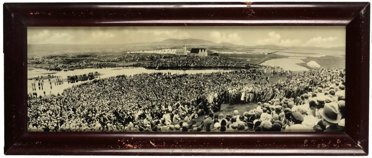 Panorama ljósmynd frá Alþingishátíðinni 1930, innrömmuð. Tekin af Ágústi Breiðdal. Horft frá Lögbergi yfir mannfjölda í áttina að Þingvallabænum og kirkjunni.