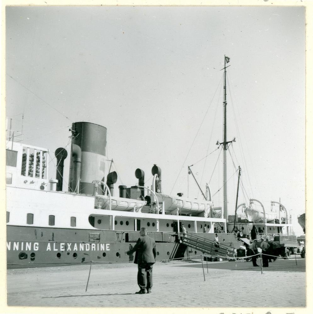 Skipið Dronning Alexandrine e/s við bryggju í Kaupmannahöfn. Fólk um borð og eins gengur um landganginn. Vörubíll stendur við skipið.