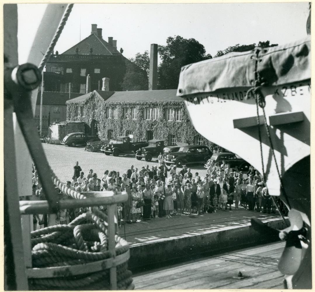 Horft frá skipinu Dronning Alexandrine e/s til hafnar. Fjöldi fólks á bryggjunni, bílar og verksmiðjuhús í bakgrunni.