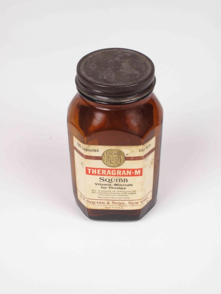 Áttstrent lyfjaílát úr brúnu gleri, á botni merkt:" gI5/12/265/Duraglas". Stútvítt með áskrúfuðu brúnu málmloki. Áglasið er álímdur, prentaður miði með fyrirsögninni THERAGRAN- M / Savibb.