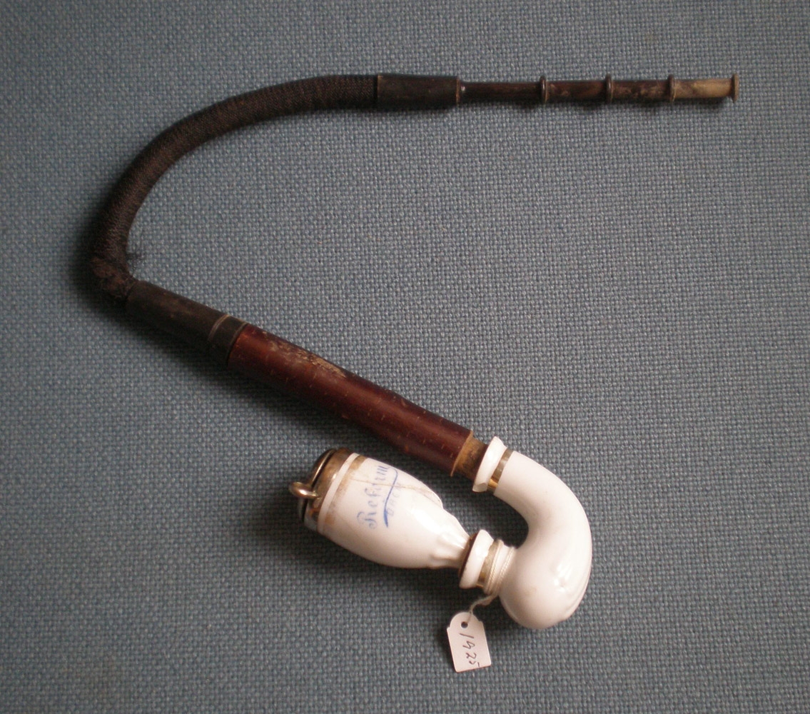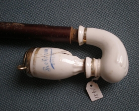 Reykjarpípa úr eigu Andrésar Fjeldsted, Ferjukoti. Hún er stór og óvanaleg, haus úr postulíni og málmi, skaft og munnstykki úr tré og þar á milli sveiganlegur hólkur. Áletrun er þýsk.