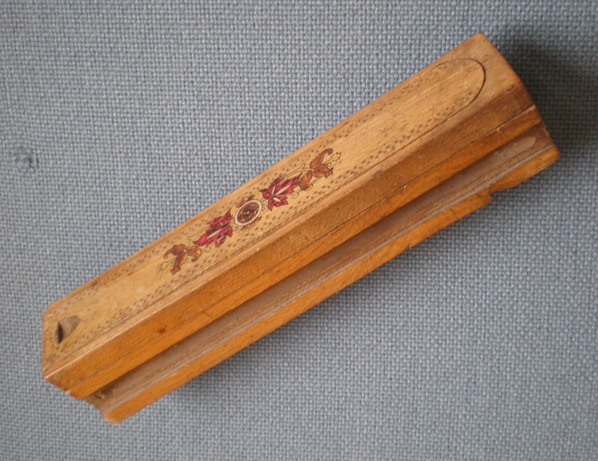 Pennastokkur úr tré með útdraganlegum lokum, lengd 24 cm, innfluttur.
