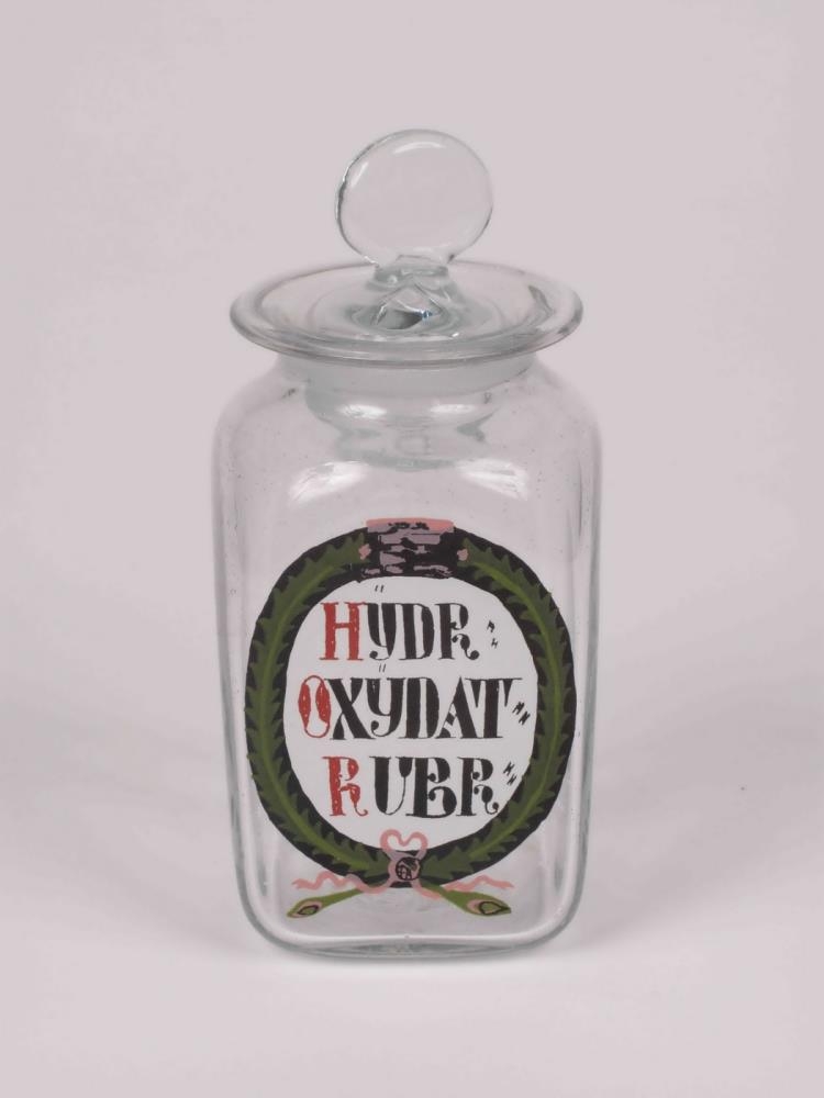 Ferstrend flaksa úr ólituðu gleri með víðum stút og glertappa, áletruð: HYDR: OXYDAT: RUBA:Merkt HG8 Þessum tevimur HG8 [NS 3198 og NS 3199] fylgdi umslag frá "Augustenborg Apotek /Anno 1799-1935" en í því er upplýsingar um það en ekki frá aldri flaskanna. Lyfjaglasið er nákvæm eftirlíking af fyrirmyndum úr dönskum apótekum gerðum í samvinnu Kastrups og Holmgaards Glasverker A/S og Bang-s Tegner A/S. Hvert þeirra (NS 3196-NS 3202) er á botni merkt H. G. og útgáfuári t.d H.G. 6 = 1976
