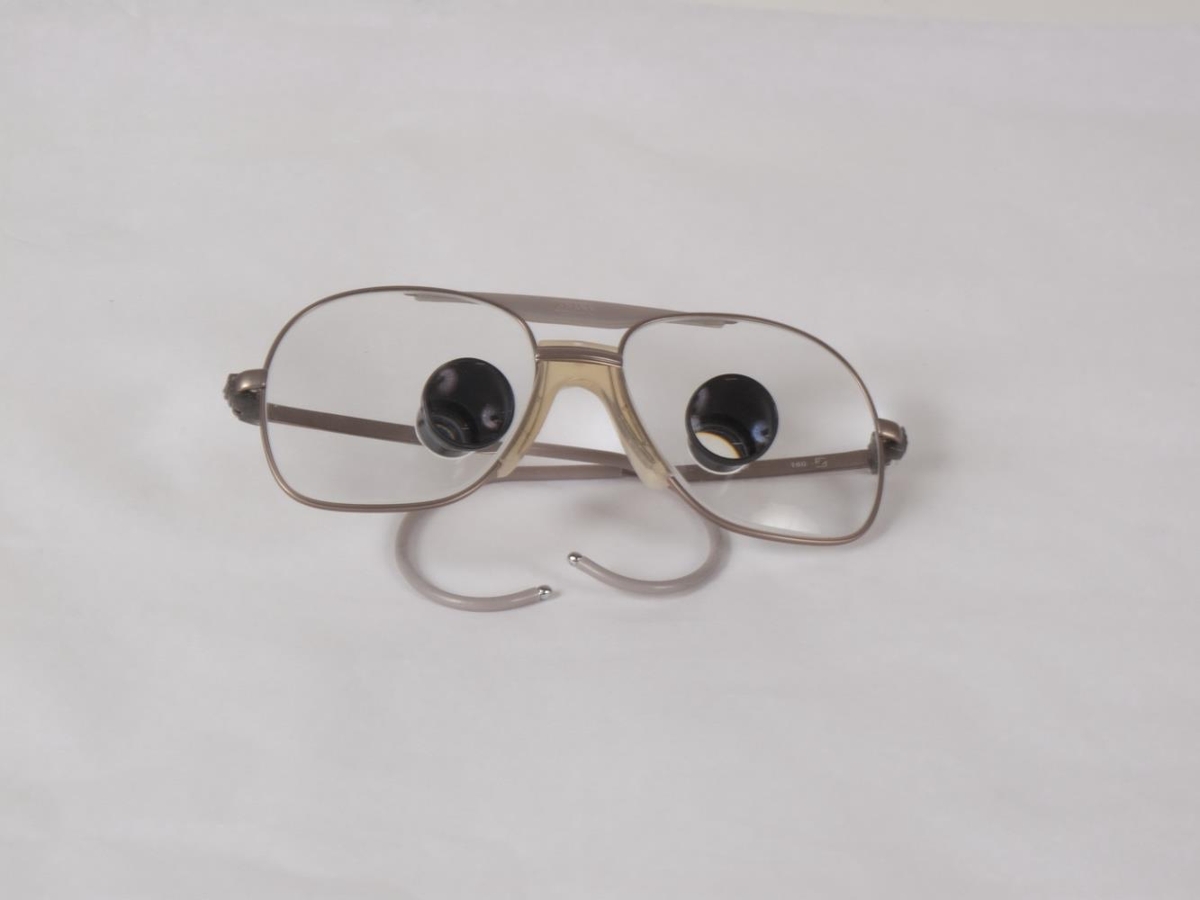 Gleraugu með áföstum stillanlegum stækkunarlinsum til notkunar við skurðlækningar.Stækkun x * 500 mmMerkt framleiðandanum Carl Zeiss / West-Germany Með fylgja leiðbeiningar á ensku um hvernig á að stilla linsuna.