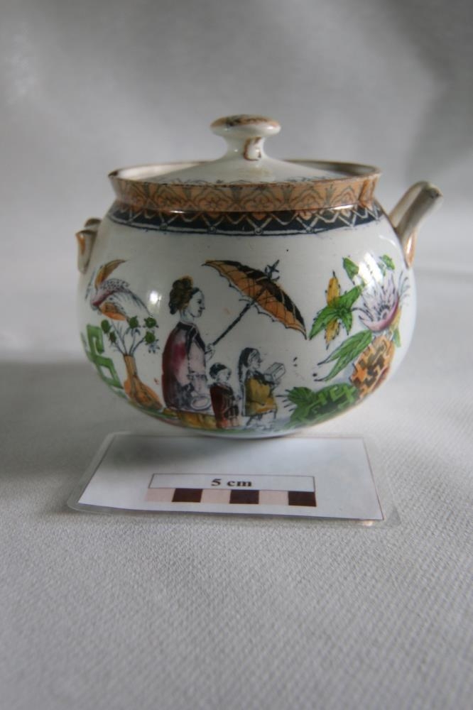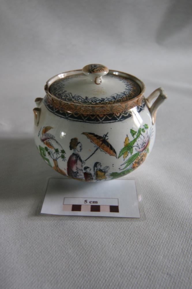 Hvítt og fagurlega skreytt sykurkar úr postulíni. Á hlið karsins sést gengur móðir með regnhlíf í fylgd tveggja barna í einhvers konar skrúð- eða lystigarði, að því er virðist. Engar upplýsingar eru á því um upprunaland. Oddný Methúsalemsdóttir, Ytri-Hlíð, gaf það og hafði fengið úr gamla Bustarfellsbúinu. Mun það hafa verið fornlegt þegar hún mundi eftir.