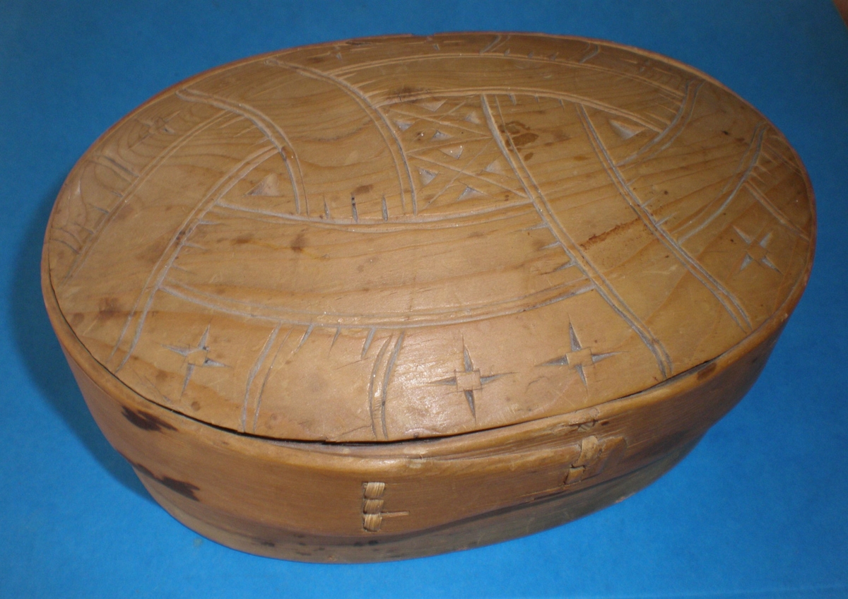 Sporöskjulöguð askja úr ljósum viði, með útskornu loki, stærð botns 15 x 9.5 og hæð 7 cm.