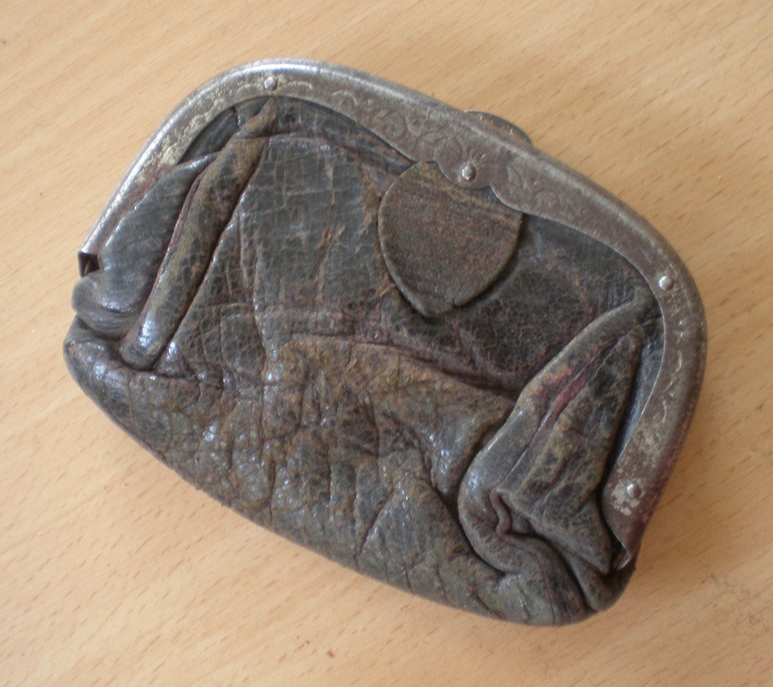 Peningabudda, úr leðri, svört, gömul og slitin með málmlæsingu. Í henni er 1 skammtabréf með lyfi frá Reykjavíkuapóteki.