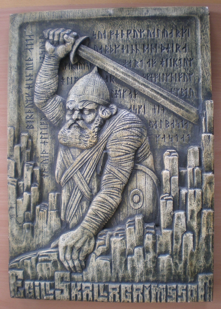 Lágmynd úr gifsi af Agli Skallagrímssyni, stærð 40 x 27.5 cm. Myndin er af Agli með hjálm og skjöld og sverð reitt til höggs. Í bakgrunni er rúnaletur. Plattinn er úr eigu Sólmundar Sigurðsssonar (f. 2. júlí 1899, d. 24.júní 1985 ) frá Borgarnesi.