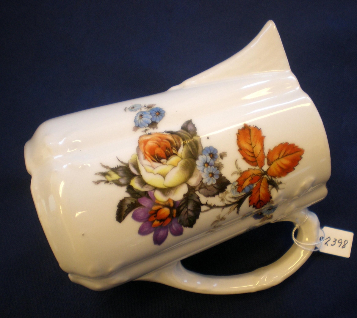 Hvít kanna, 14 cm há með ámáluðum og upphleyptum blómum ásamt gyllingu.
