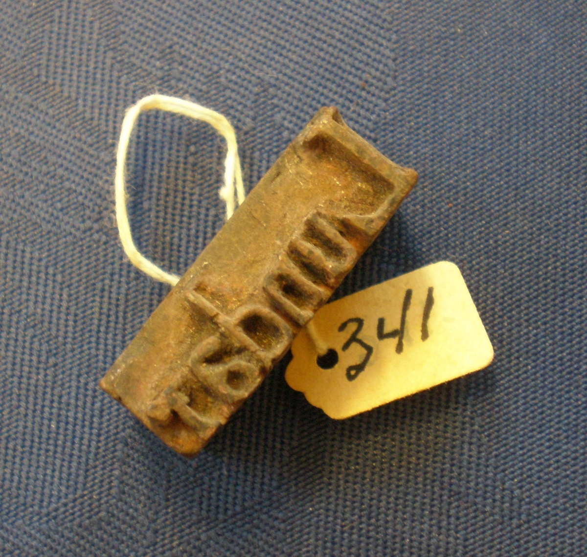 Brennimark. lítið og skaftlaust. Á því eru upphleyptir stafir, orðið ,,Lundar“ með spegilskrift.