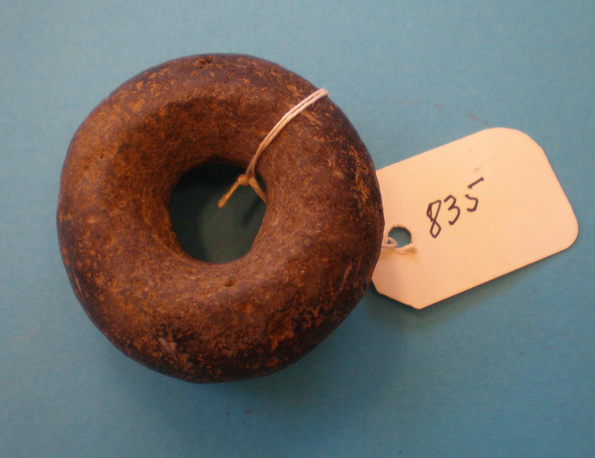 Steinhringur, kringlóttur steinn með gati og er líklega af bor. Ytra þvermál hringsins er 5 cm.