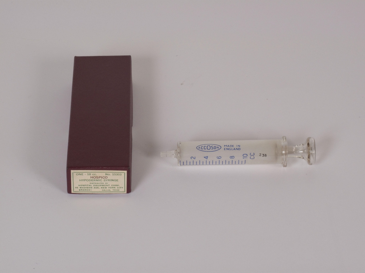 Glersprauta. 10 ml. með Luer stút og í upprunalegum umbúðum.Kvarði: 10 ccÁ sprautuna er prentað: "Accoson, Made in England" Talan 238 greypt í sprautu og stimpil.Á umbúðir er m.a. prentað: "Hospico. Hypodermic syringe. Distributed by Hospital Equipment Corp., New York City / Branch: Dallas, Texas" og "The tip groove is covered by U.S. Patent no. 1,998,982"