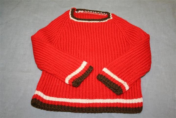 Handprjónuð rauð barnapeysa, gefandi prjónaði.