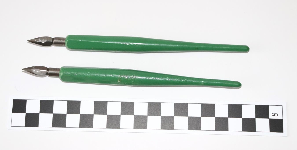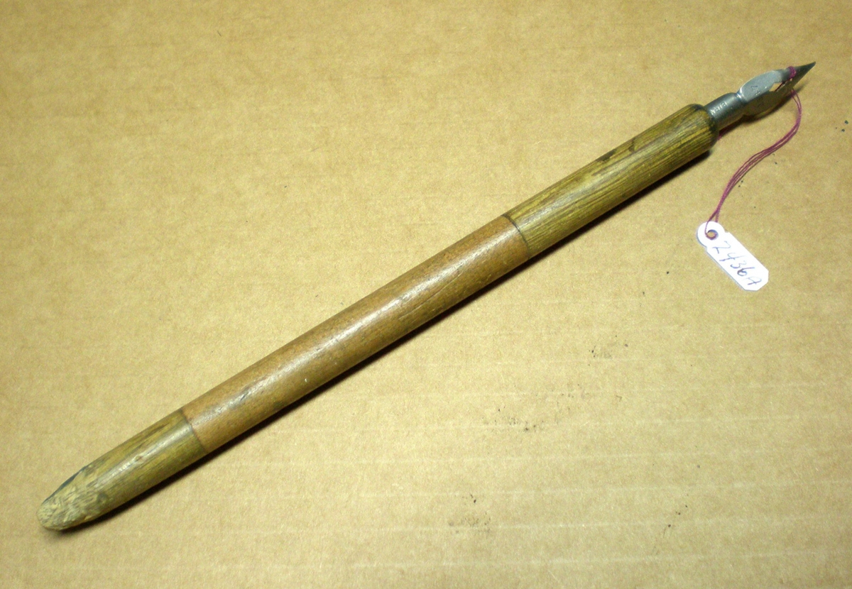 Pennastöng með penna úr eigu Sigurðar Þórólfssonar, skólastjóra Hvítárbakkaskóla, en hann var faðir gefanda. Sigurður notaði stutta og svera pennastöng, og hélt á henni milli vísifingurs og löngutangar.
