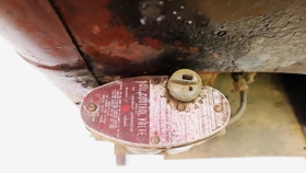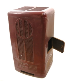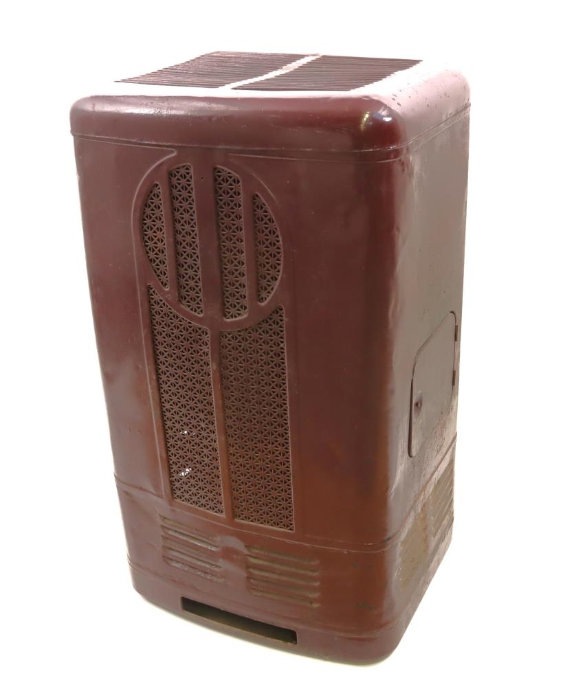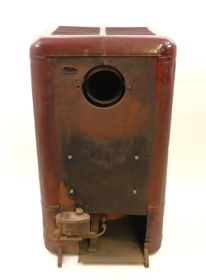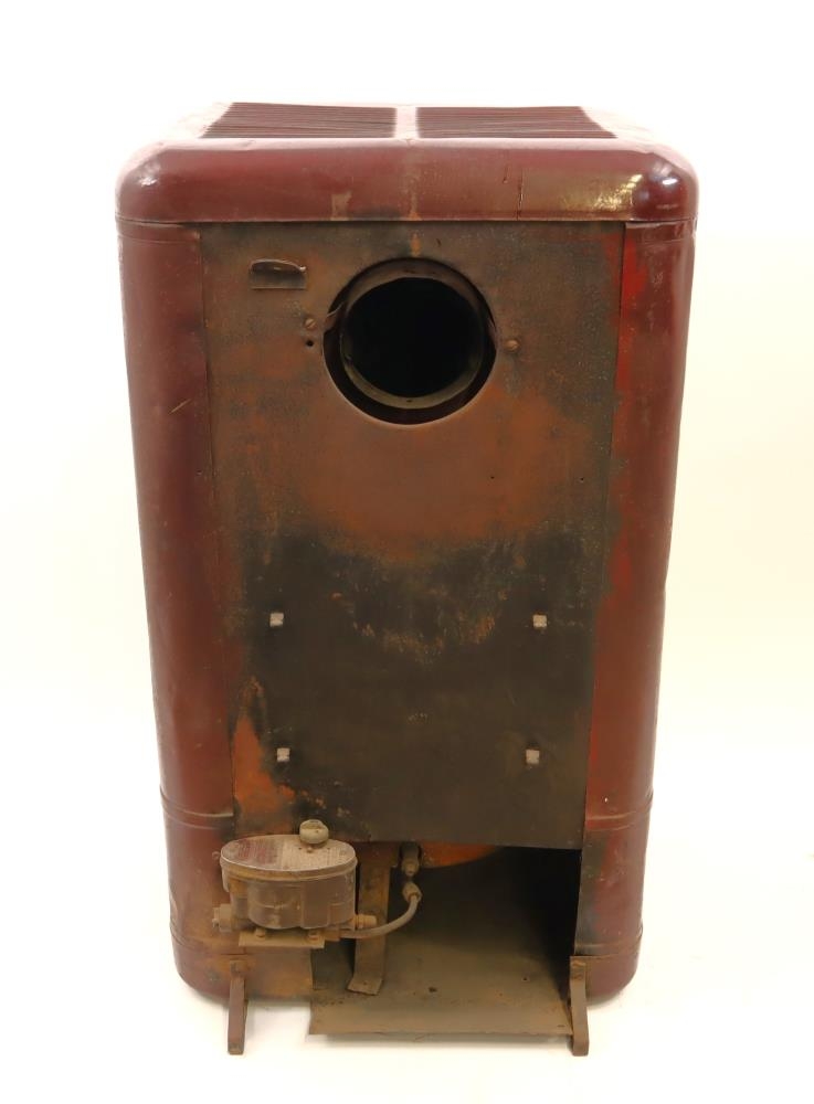 Olíuofn frá ameríska hernum. Opnanlegt hólf á hlið. Loftristar og grindur á öllum hliðum. Á bakhlið er op fyrir rör og tækjabúnaður fyrir stillingar. Ofninn er vínrauður að lit.