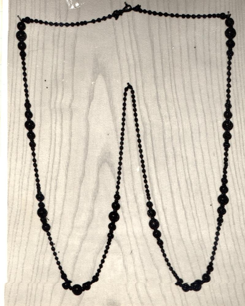 Perlufesti úr tré, svört. Lengd 154 cm, átt hefur Guðrún Ketilsdóttir húsfreyja á Stokkalæk, f. 1840, d. 1909. Gjöf frá Jóni Egilssyni Selalæk.