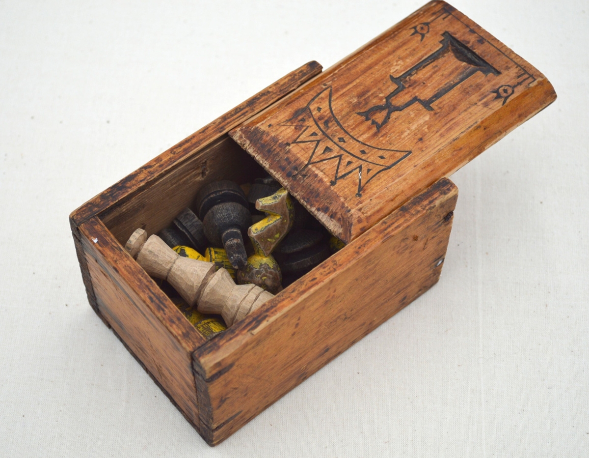 Taflmenn og útskorinn taflstokkur ártal 1878, 9 x 12 cm. Átt hefur Jón Jónsson bóndi í Fljótsdal, f. 1.8.1810 d. 13.8.1904, síðar átti taflið Ágúst Jónsson sonur hans f. 1864 d. 1934. Tengdasonur hans Nói Kristjánsson gaf mér 17.10 1956.