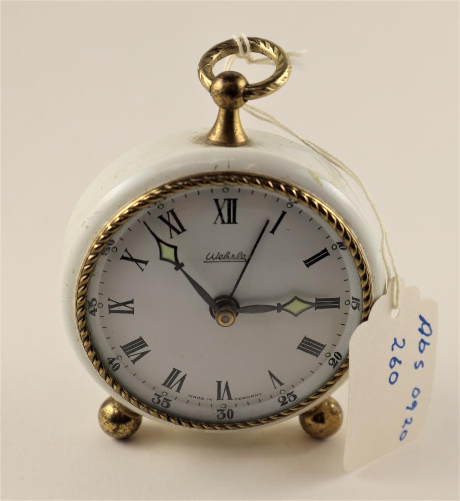Vekjaraklukka, Wherle, skrautleg útgáfa af algengri vekjaraklukku sem seld var hjá Magnúsi Benjamínssyni 1972, Þýsk.