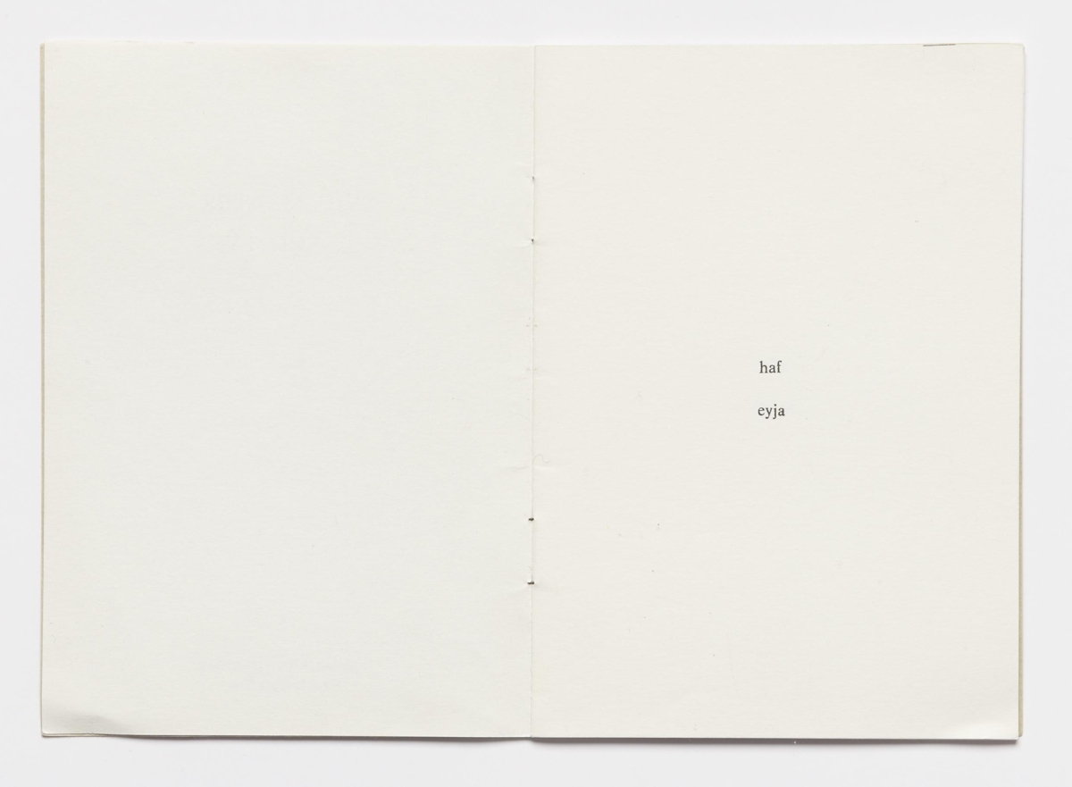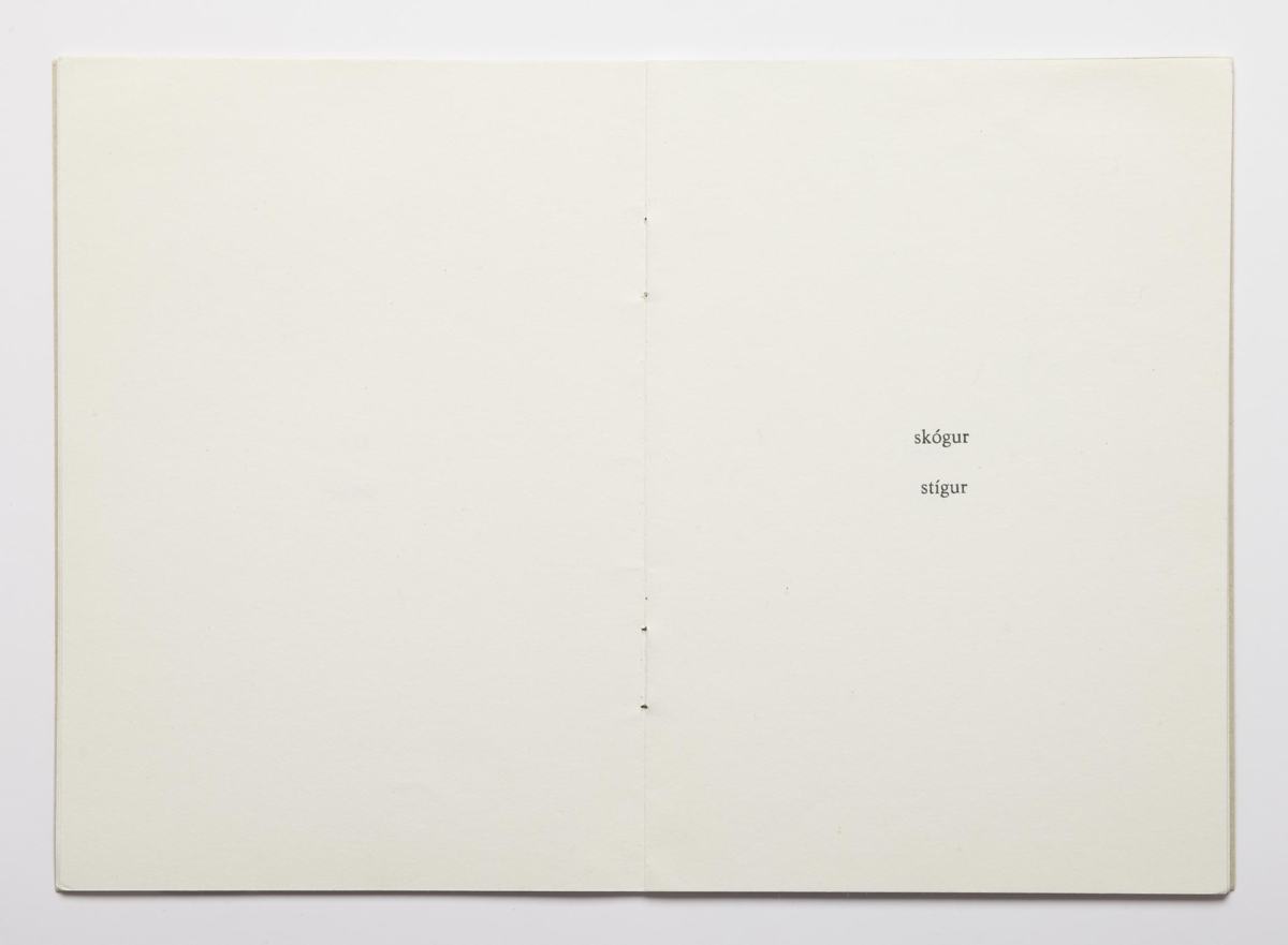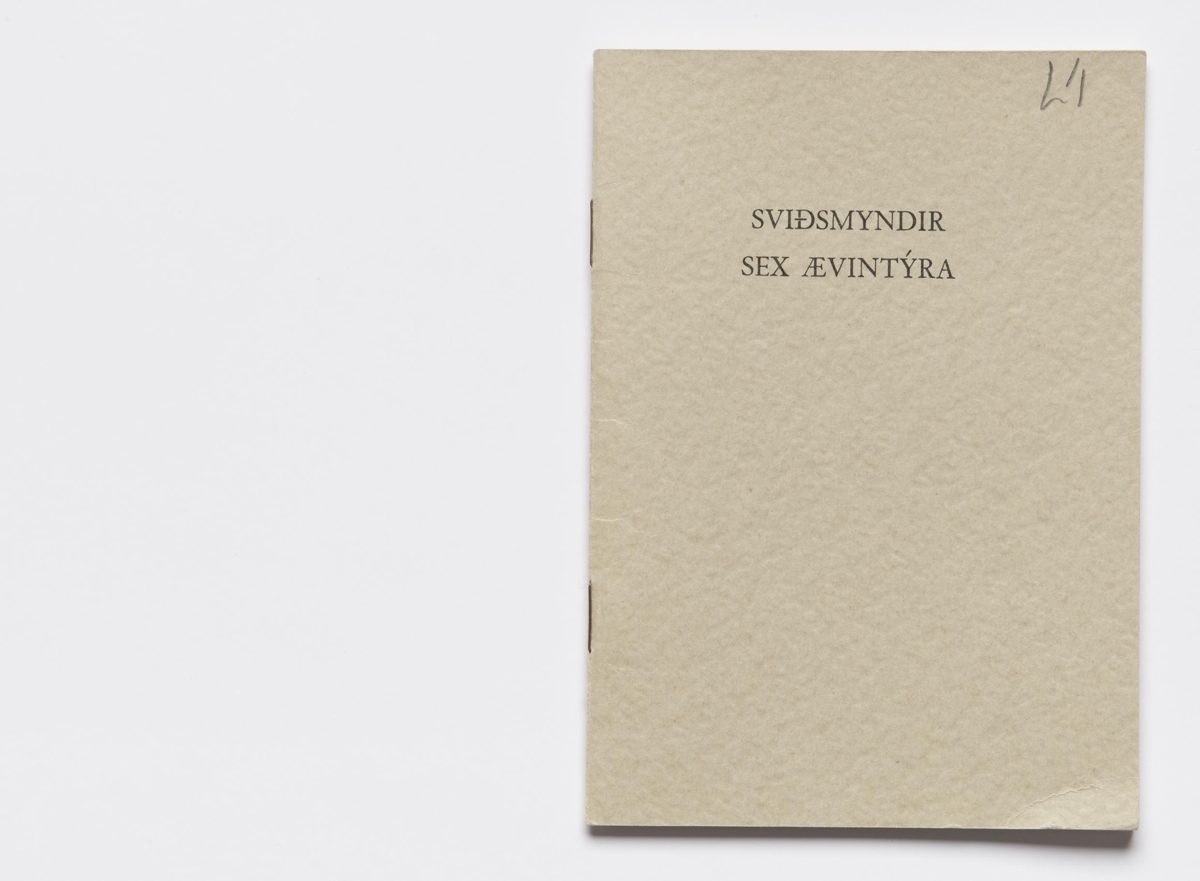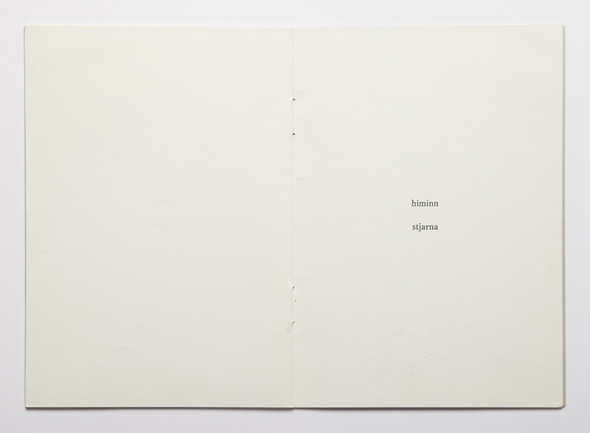 The artist’s book consists of sceneries for six fairytales by Ingólfur Arnarsson. The sceneries are presented by two words that indicate the surroundings of the tales. The artist’s book is 16 unnumbered pages with black print on matte paper. The book is in staple binding with a soft cover. The book was published by Ingólfur Arnarsson in 1979. The edition is 50 numbered and signed copies.