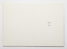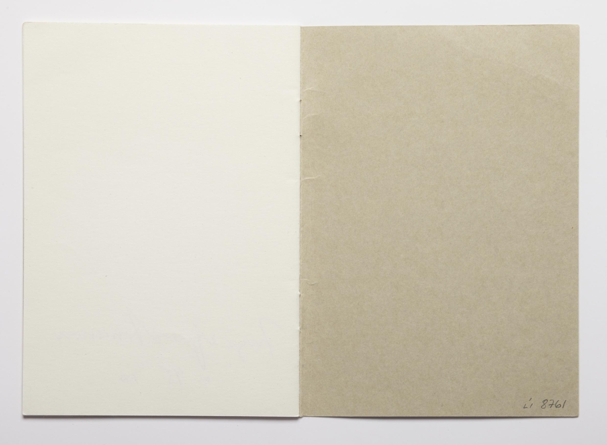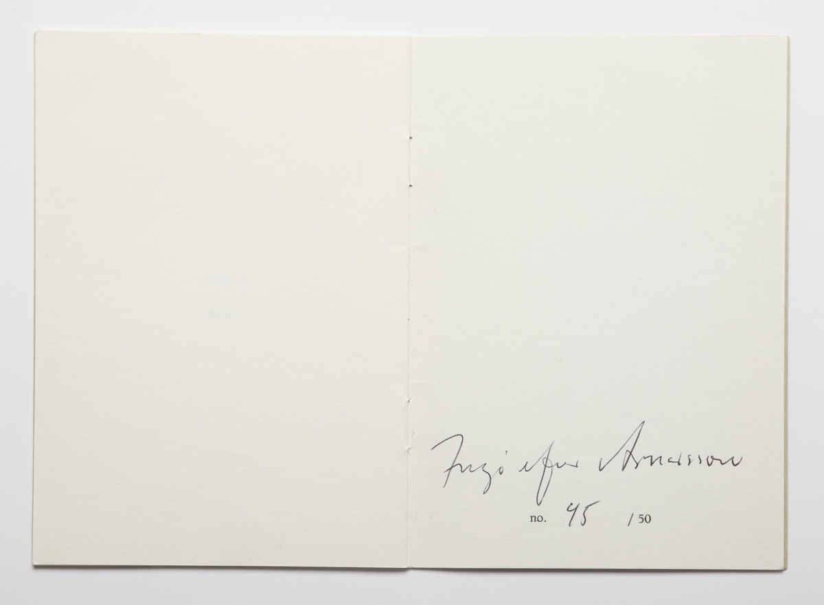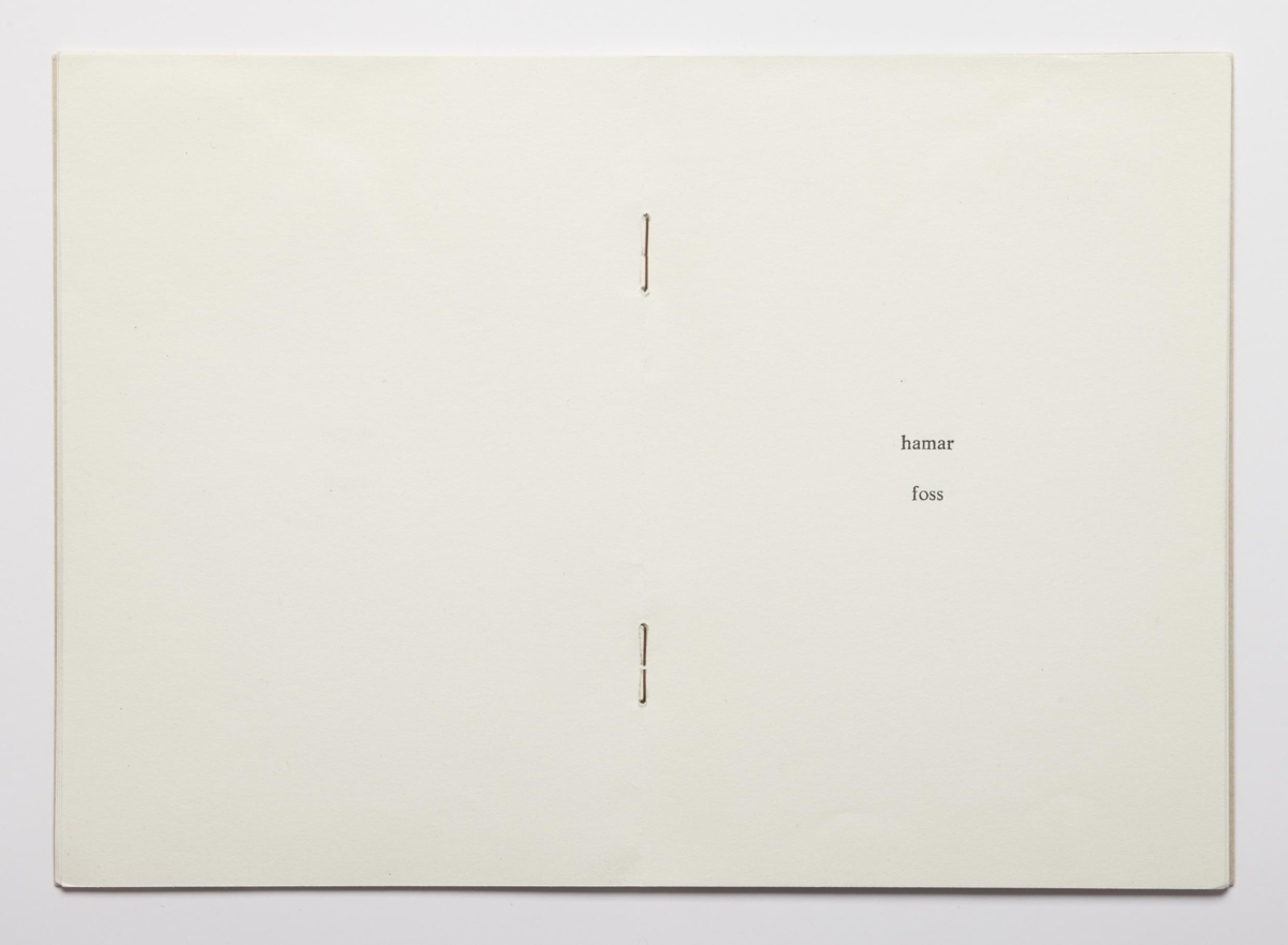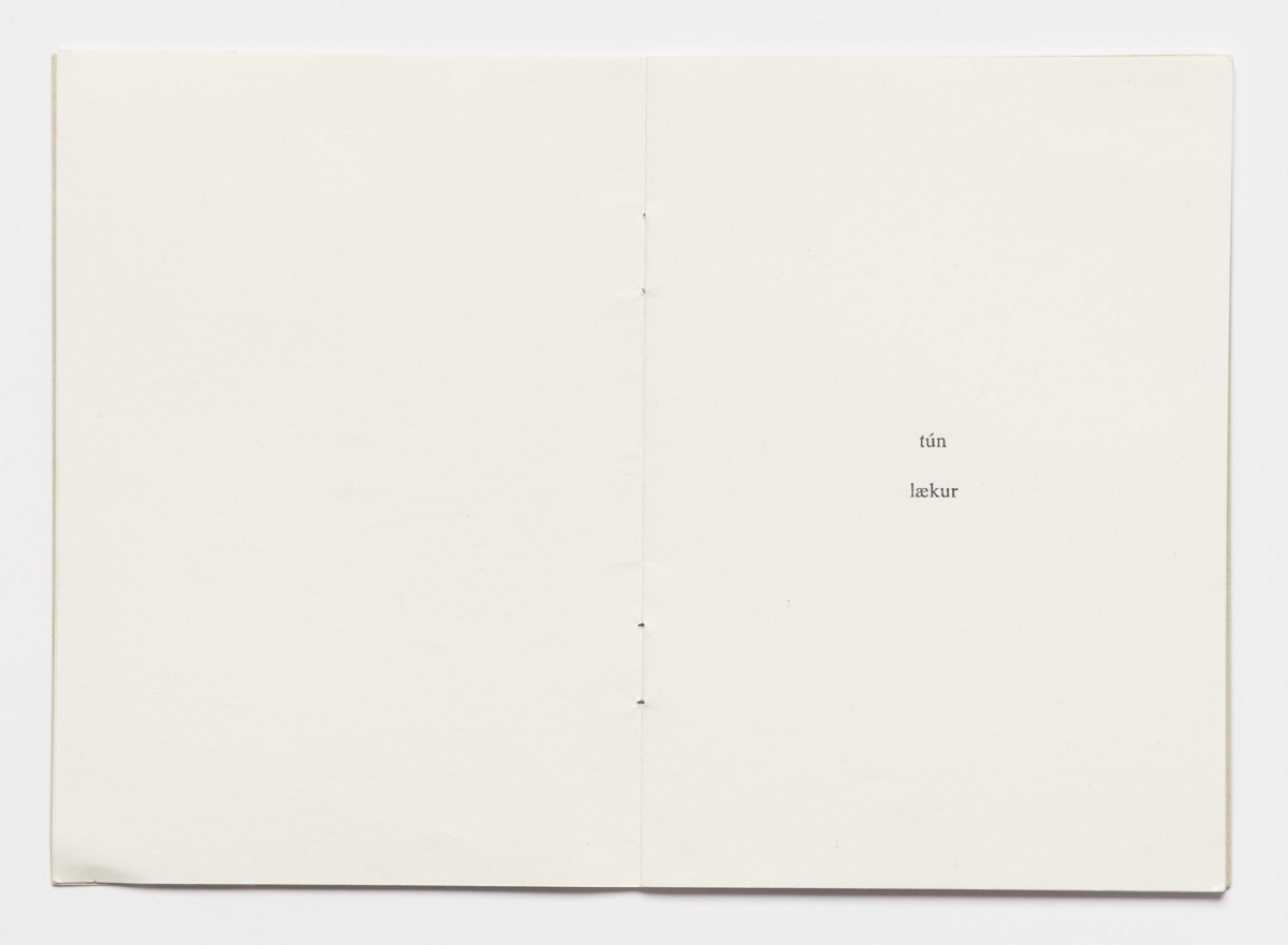 The artist’s book consists of sceneries for six fairytales by Ingólfur Arnarsson. The sceneries are presented by two words that indicate the surroundings of the tales. The artist’s book is 16 unnumbered pages with black print on matte paper. The book is in staple binding with a soft cover. The book was published by Ingólfur Arnarsson in 1979. The edition is 50 numbered and signed copies.