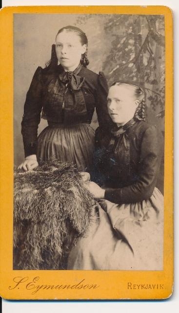 Tvær konur í sparifötum. Systur frá Auðsholti í Ölfusi, Sigríður Jakobsdóttir (1877-1959) saumakona í Reykjavík og Guðrún Jakobsdóttir (1873-1964) húsfreyja í Reykjavík, Ósi Skilamannahreppi og Narfeyri á Skógarströnd. Faðir þeirra var Jakob Árnason bóndi í Auðsholti í Ölfusi.