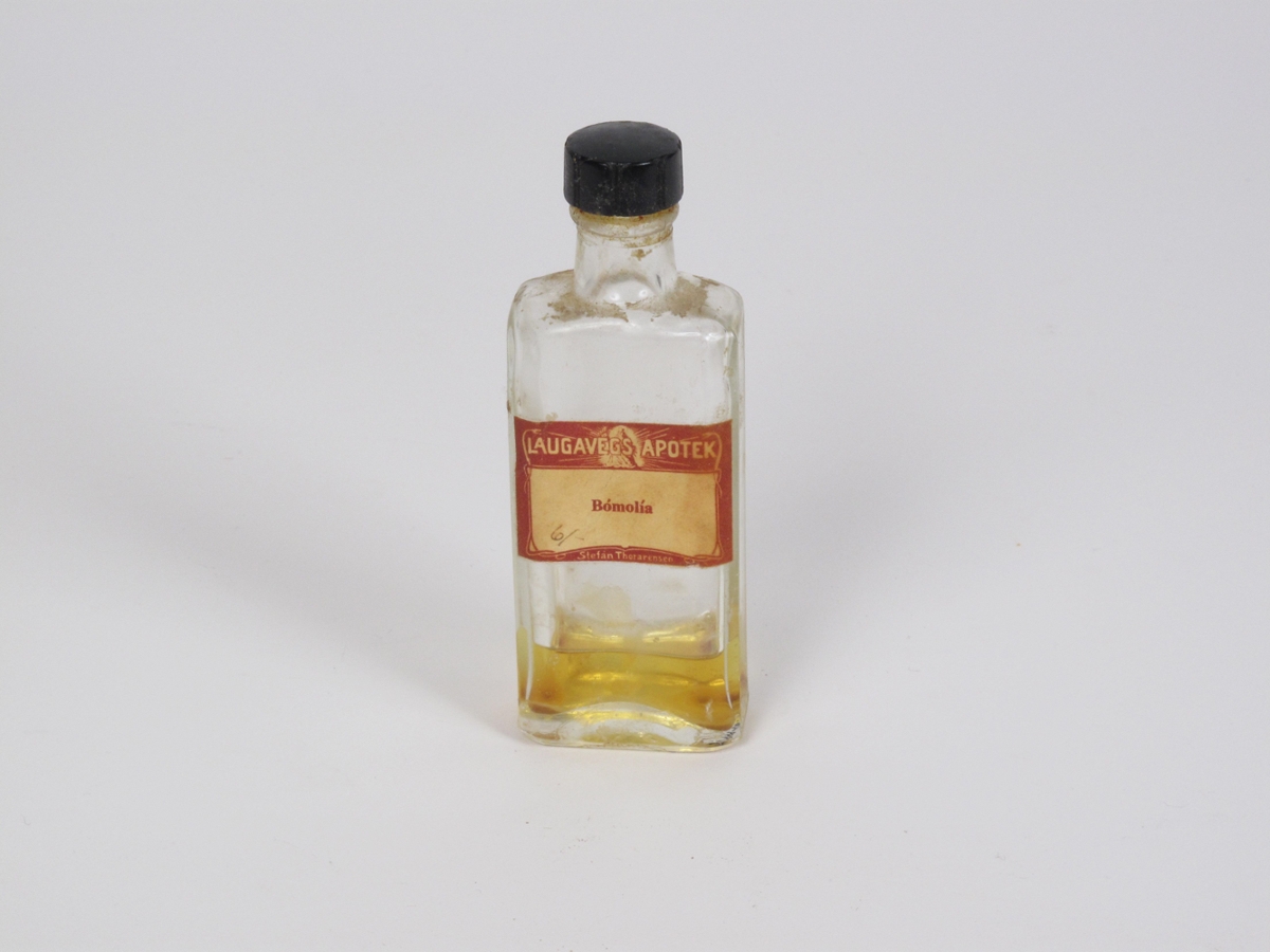 Bómolía í lyfjaglasi, miði á glasinu er merktur Laugavegsapóteki. Þetta er hluti af gripum úr fórum Árna Helgasonar læknis.