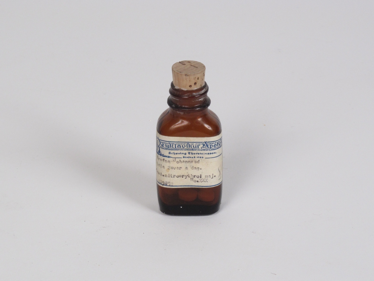 Lyfjaglas frá Reykjavíkurapóteki merkt Hrefnu Jóhannsdóttur. Kom ásamt dóti úr fórum Árna Helgasonar lækni en hann var eiginmaður Hrefnu.