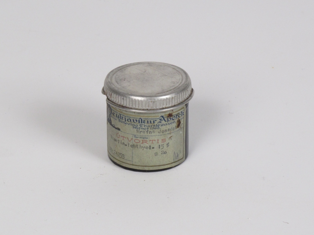Vaselin lachthyol. 15g notist útvortis. Glerkrukka frá Reykjavíkurapóteki merkt Hrefnu Jóhannesdóttur. Kom ásamt öðrum gripum úr fórum Árna Helgasonar læknis, en hann var eiginmaður Hrefnu.