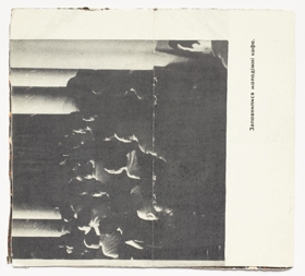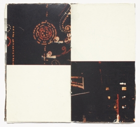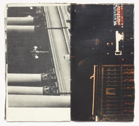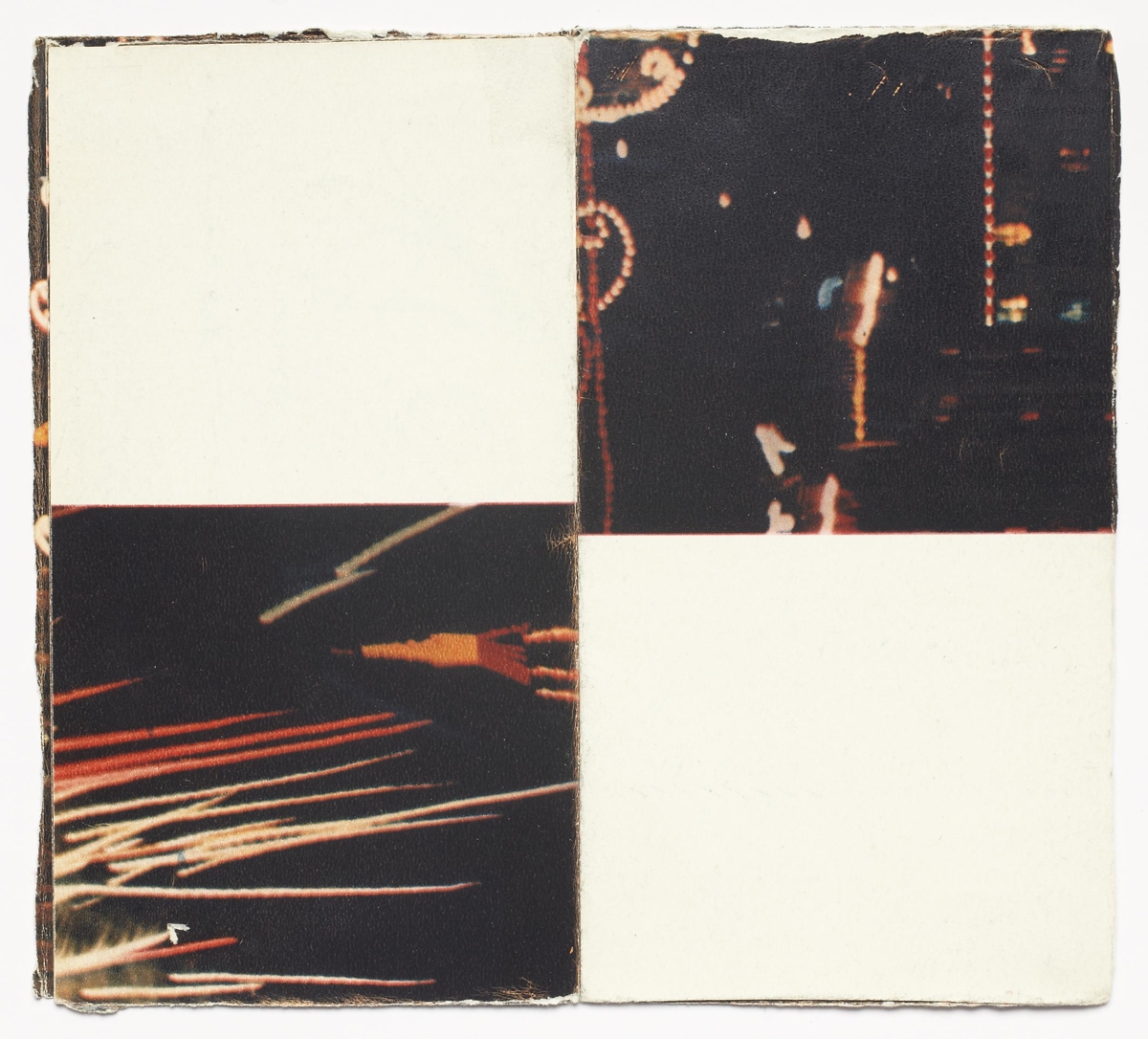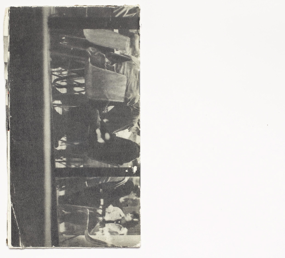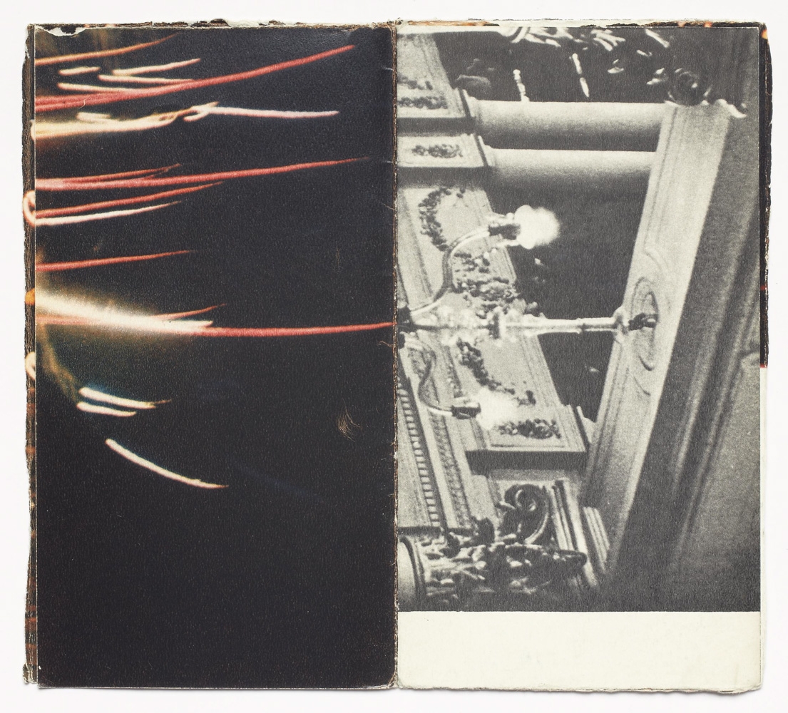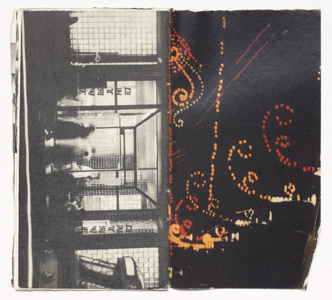The book is 16 unnumbered pages created from one folded page from a found book. The pages are glossy with black-and-white and colour images. The book is in staple fold binding with a soft cover. The artist’s book was created by Þorvaldur Þorsteinsson in 1988. Each copy is unique and signed.