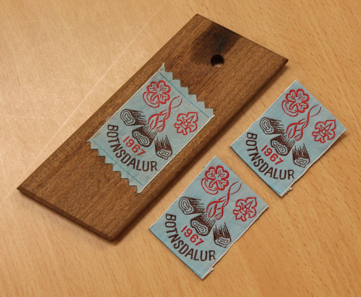 Merki skátamóts í Botnsdal 1967, þrjú stk., stærð 4.7 x 3.2 cm. Eitt þeirra er límt á litla fjöl.