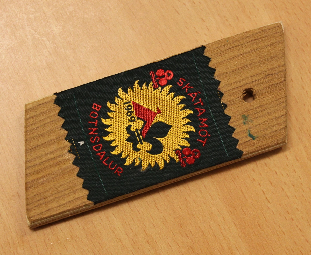 Merki skátamóts í Botnsdal 1969, stærð 6.3 x 4.5 cm. Merkið er límt á litla fjöl.