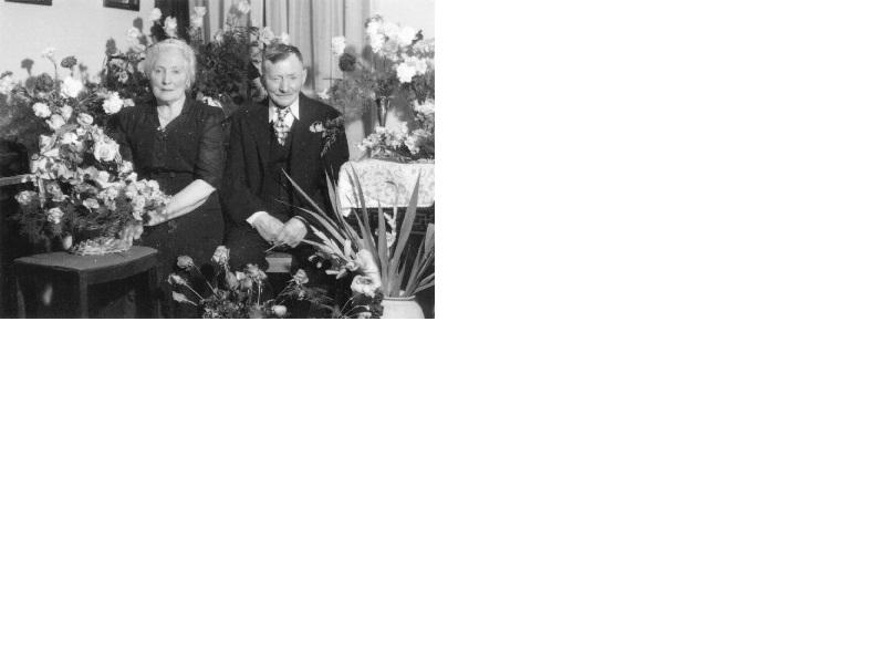 Eldri kona og maður sitja þétt saman á stólum umlukin blómum á borðum og á gólfi. Bæði eru prúðbúin. Þetta eru hjónin Ingibjörg Jónsdóttir, f. 1874 í Skálmardal í Barðastrandarsýslu, og Sveinn Bergsson, f. 1875 í Reykjavík. Þau giftu sig árið 1898 og er hugsanlegt að myndin sé tekin á gullbrúðkaupsdegi þeirra 1948. Þau áttu heima í Reykjavík frá 1925.
